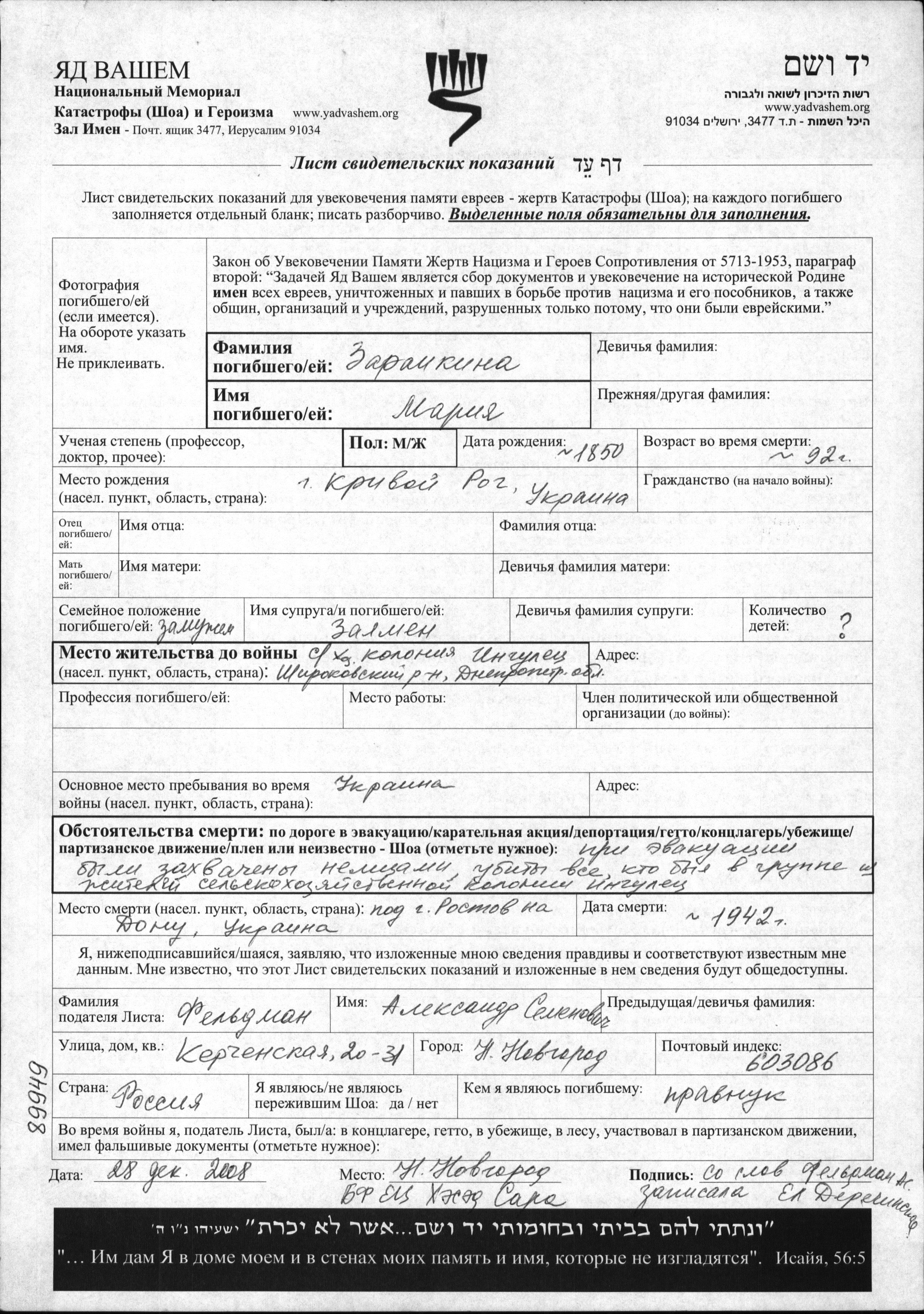 Mariya Zarankina wurde im Jahr 1850 in Krivoi Rog, Ukraine (UdSSR) geboren. Sie war mit Zalmen Verheiratet. Vor dem Zweiten Weltkrieg lebte sie in Ingulets, Ukraine (UdSSR). Während des Krieges war sie in Ukraine (UdSSR).