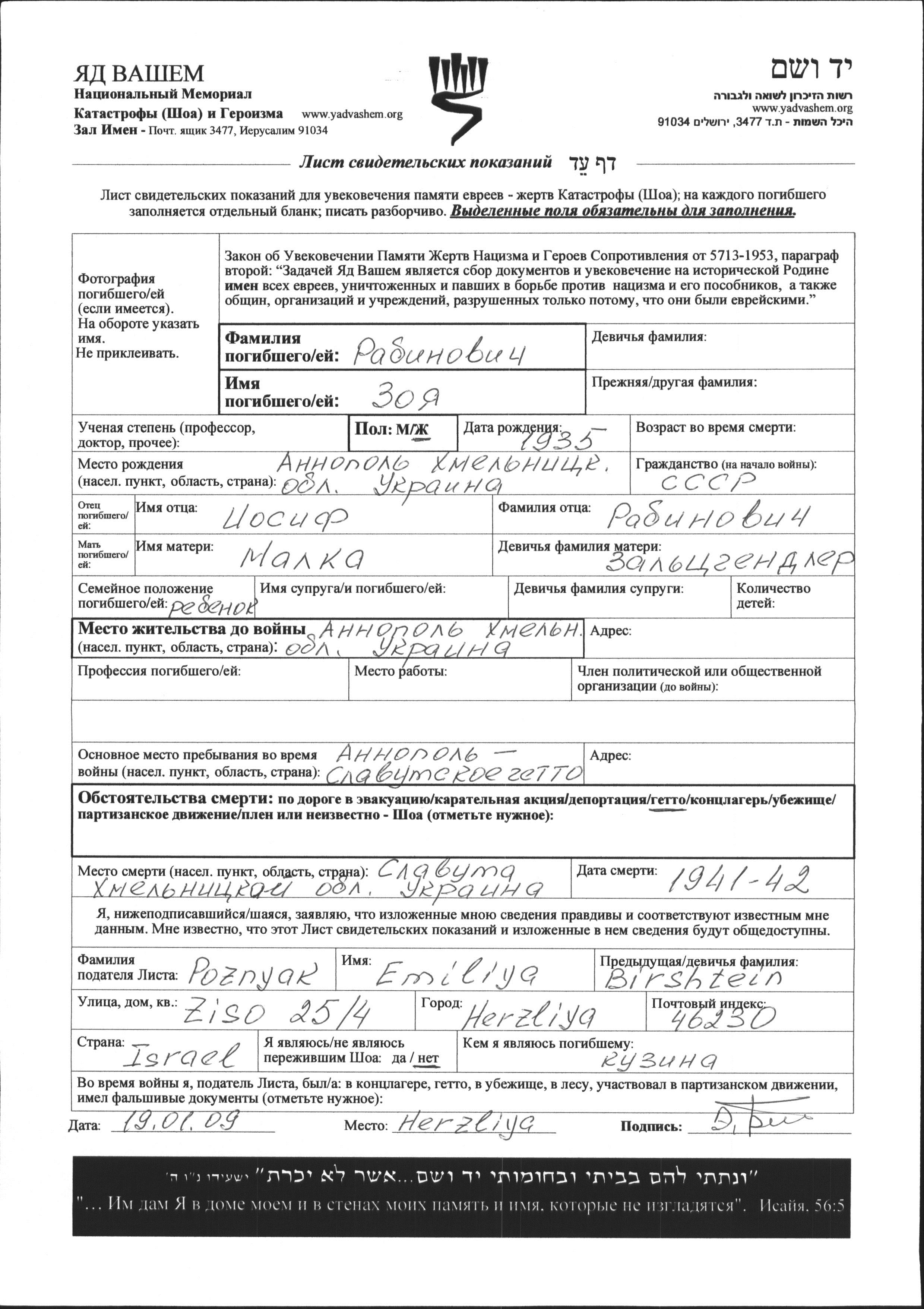Zoya Rabinovich wurde im Jahr 1935 in Annopol, Ukraine (UdSSR) geboren. Sie war die Tochter von Iosif und Malka, geb. Zaltzgendler. Sie war Kind. Vor dem Zweiten Weltkrieg lebte sie in Annopol, Ukraine (UdSSR). Während des Krieges war sie in Annopol Rachów, Polen.