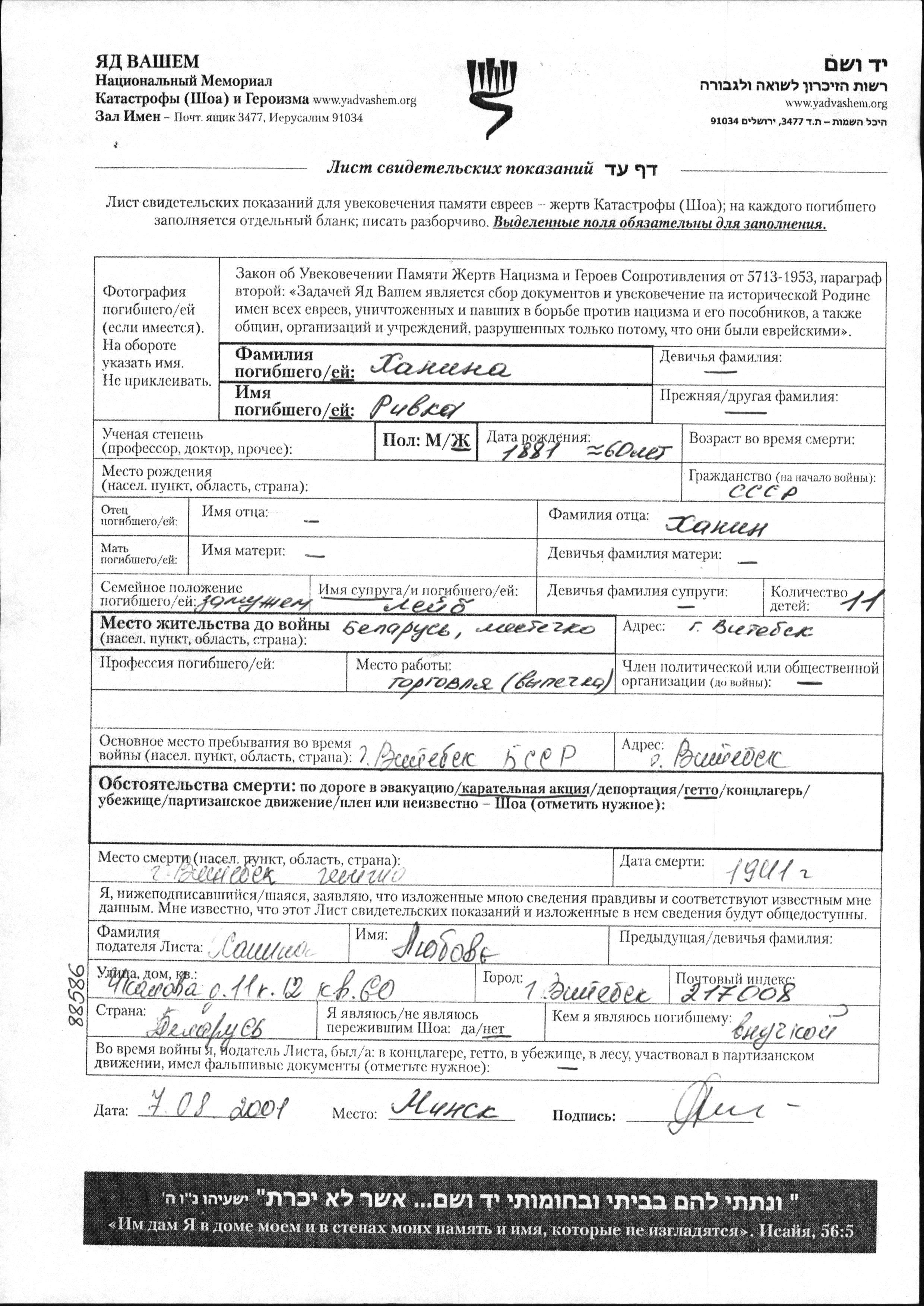 Rivka wurde in der Schoah ermordet. Todesort: Vitebsk, Weißrussland (UdSSR) im Jahr 1941.