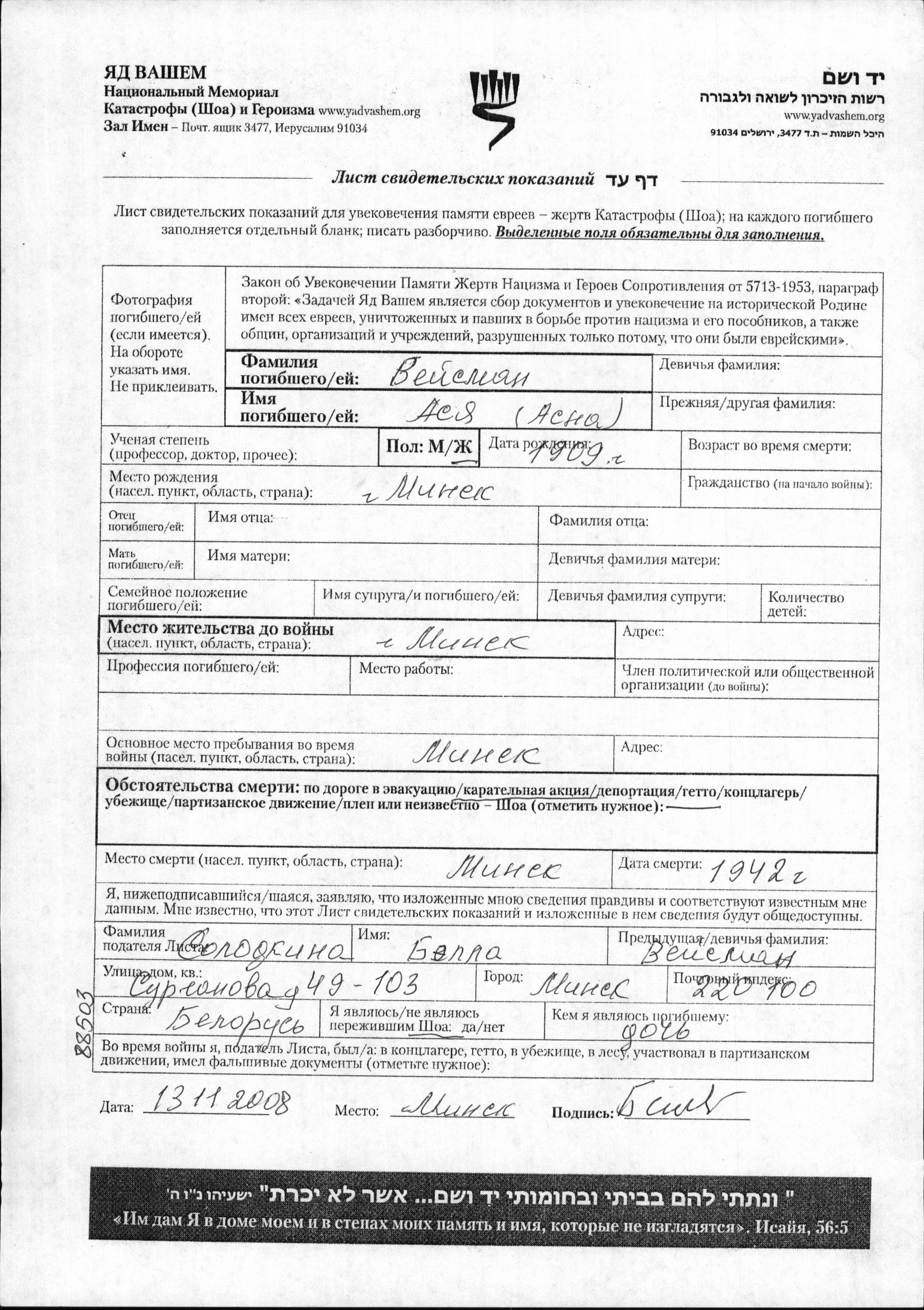 Juden wurden in der Schoah auf verschiedenste Weisen ermordet, unter anderem: Vergasen, Erschiessen, lebendig verbrannt werden, lebendig begraben werden, Tod durch Erschöpfung durch Zwangsarbeit, Epidemien, mangels jeder hygienischer Bedingung oder dem Fehlen medizinischer Versorgung. Manche Juden nahmen sich das Leben, um der Festnahme und weiterer Verfolgung zu entgehen oder ihr hoffnungsloses, nicht nachlassendes Leiden zu beenden.
