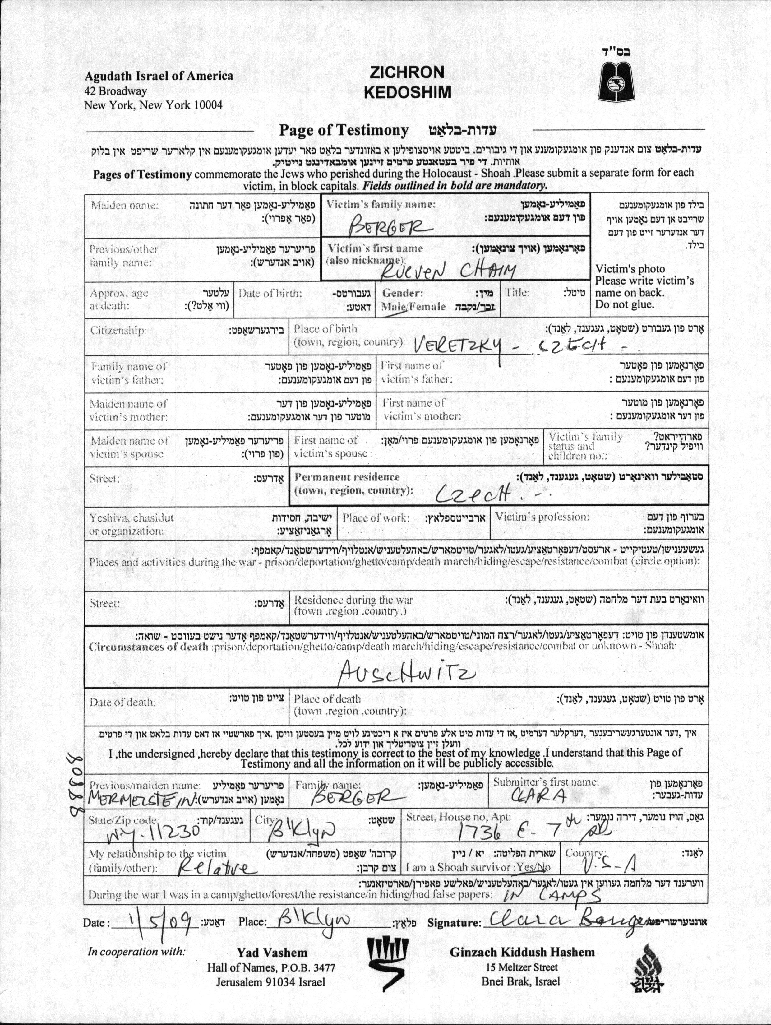 Rueven Chaim wurde in der Schoah ermordet. Todesort: Auschwitz, Polen.
