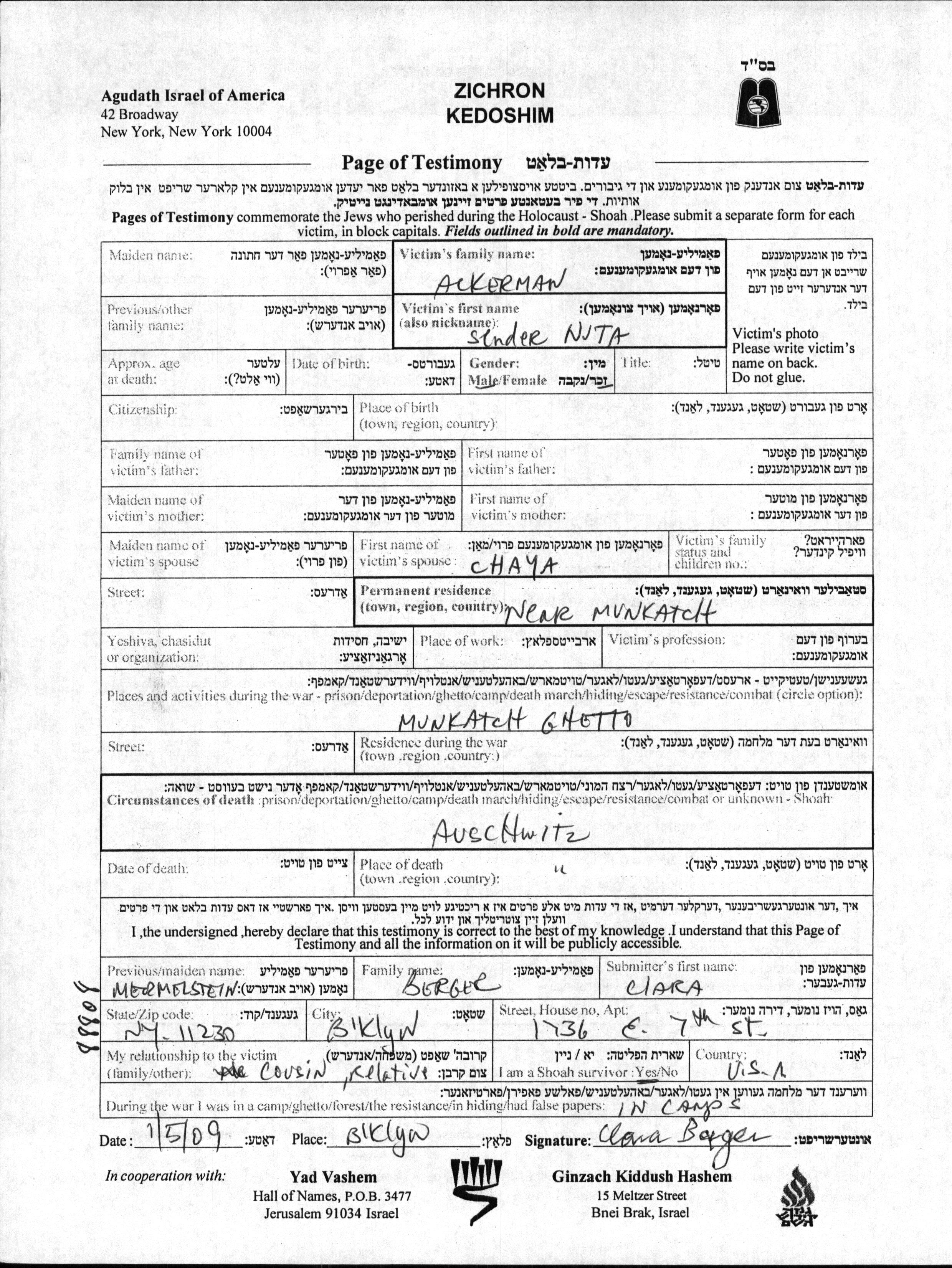 Sender Nuta Ackerman. Er war mit Chaya Verheiratet. Vor dem Zweiten Weltkrieg lebte er in Munkacs, Tschechoslowakei. Während des Krieges war er in Munkacs, Tschechoslowakei.