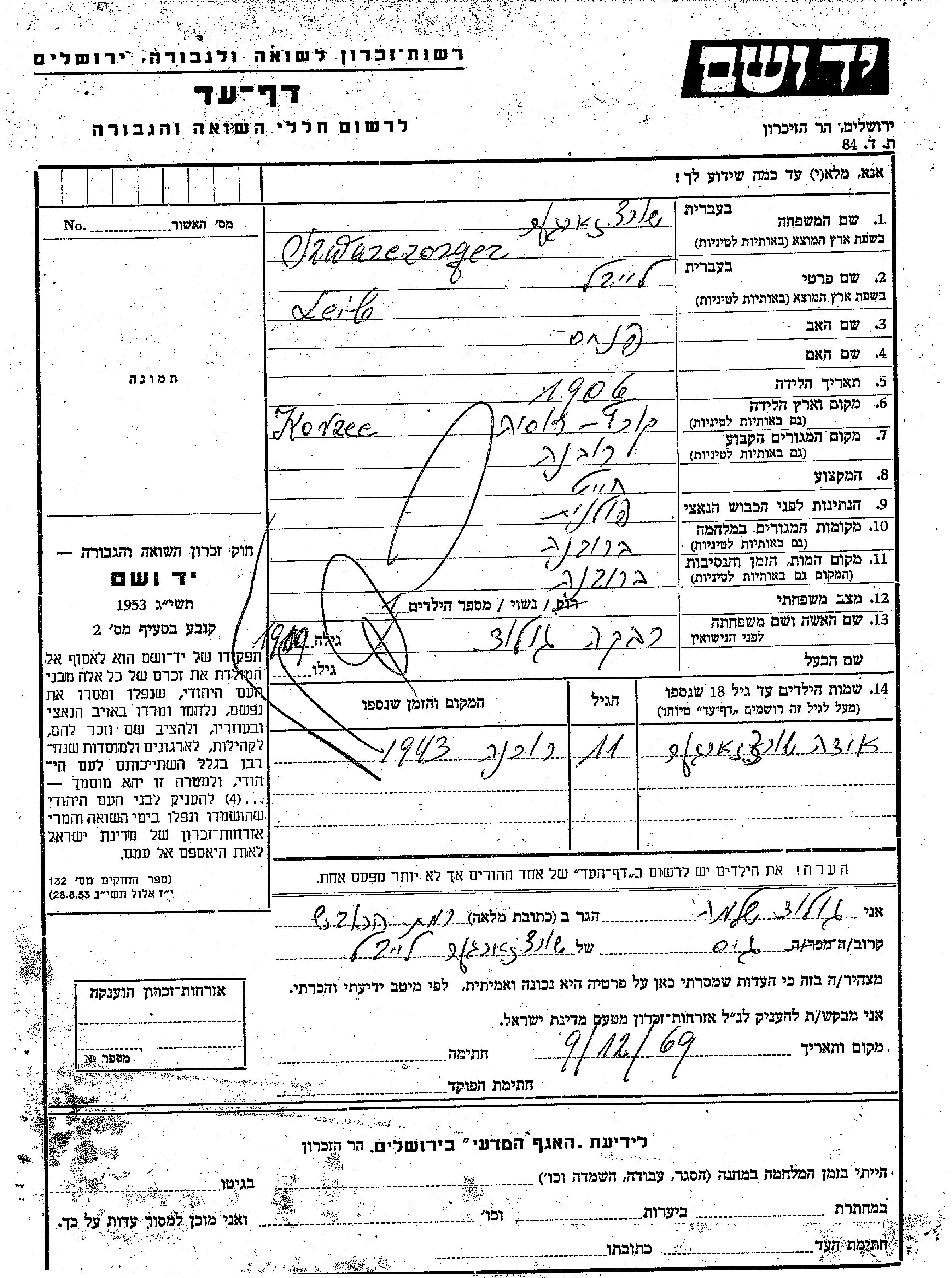 Leibel Szwarczarger wurde im Jahr 1906 in Korzec, Polen geboren. Er war der Sohn von Pinkhas. Er war Schneider und mit Rivka, geb. Golod Verheiratet. Vor dem Zweiten Weltkrieg lebte er in Rowne, Polen. Während des Krieges war er in Rowne, Polen.