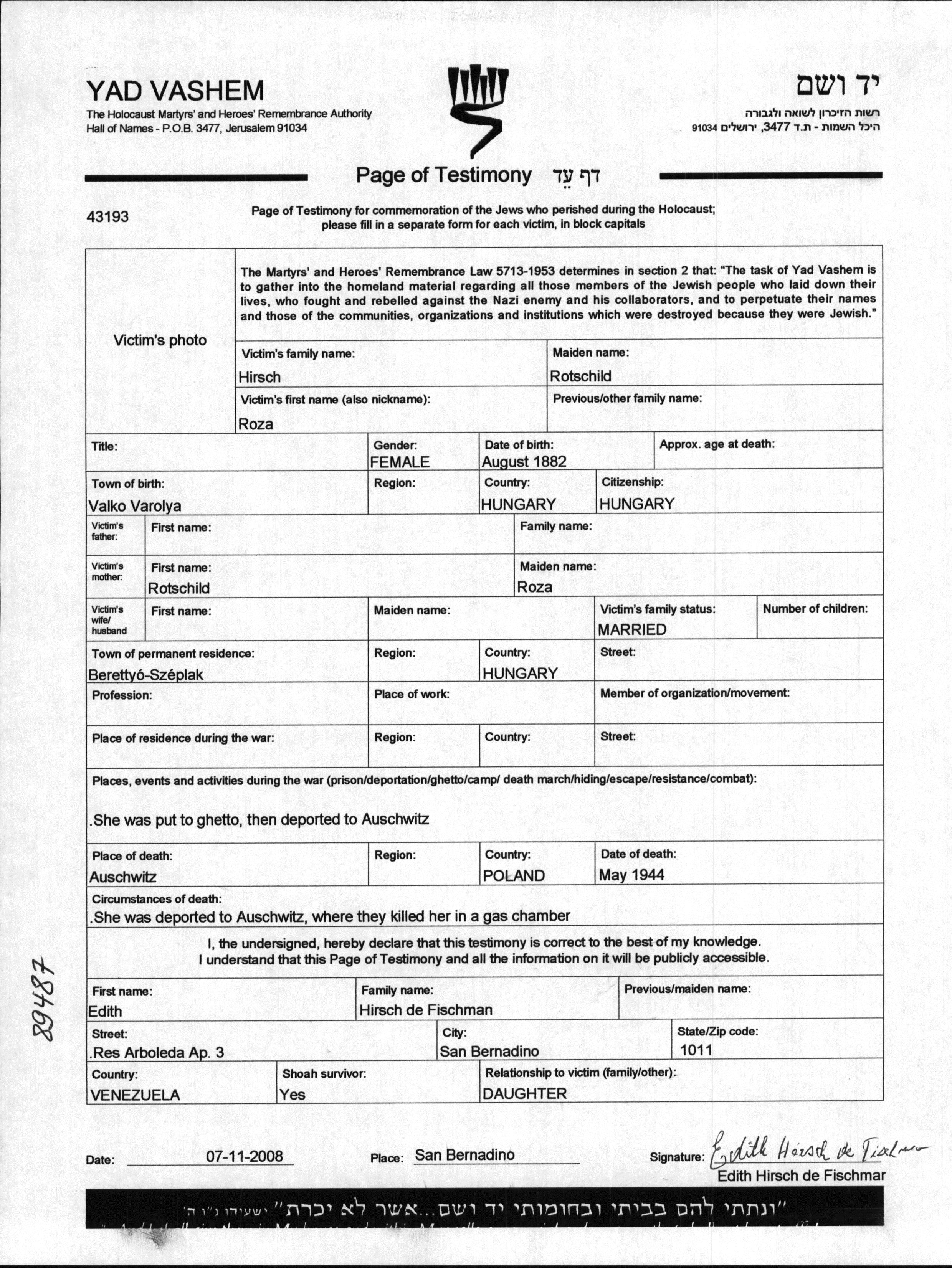 Roza Hirsch, geb. Rotschild wurde im Jahr 1882 in Valko, Rumänien geboren. Sie war Verheiratet. Vor dem Zweiten Weltkrieg lebte sie in Berettyoszeplak, Rumänien. Während des Krieges war sie in Getto.