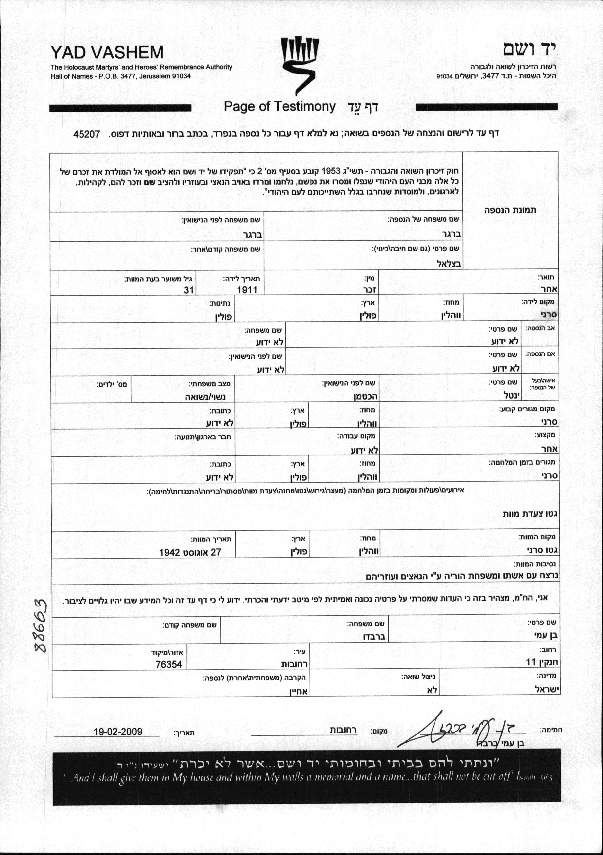 Betzalel Berger wurde im Jahr 1911 in Sarny, Polen geboren. Er war mit Yentl, geb. Hekhtman Verheiratet. Vor dem Zweiten Weltkrieg lebte er in Sarny, Polen. Während des Krieges war er in Sarny, Polen.