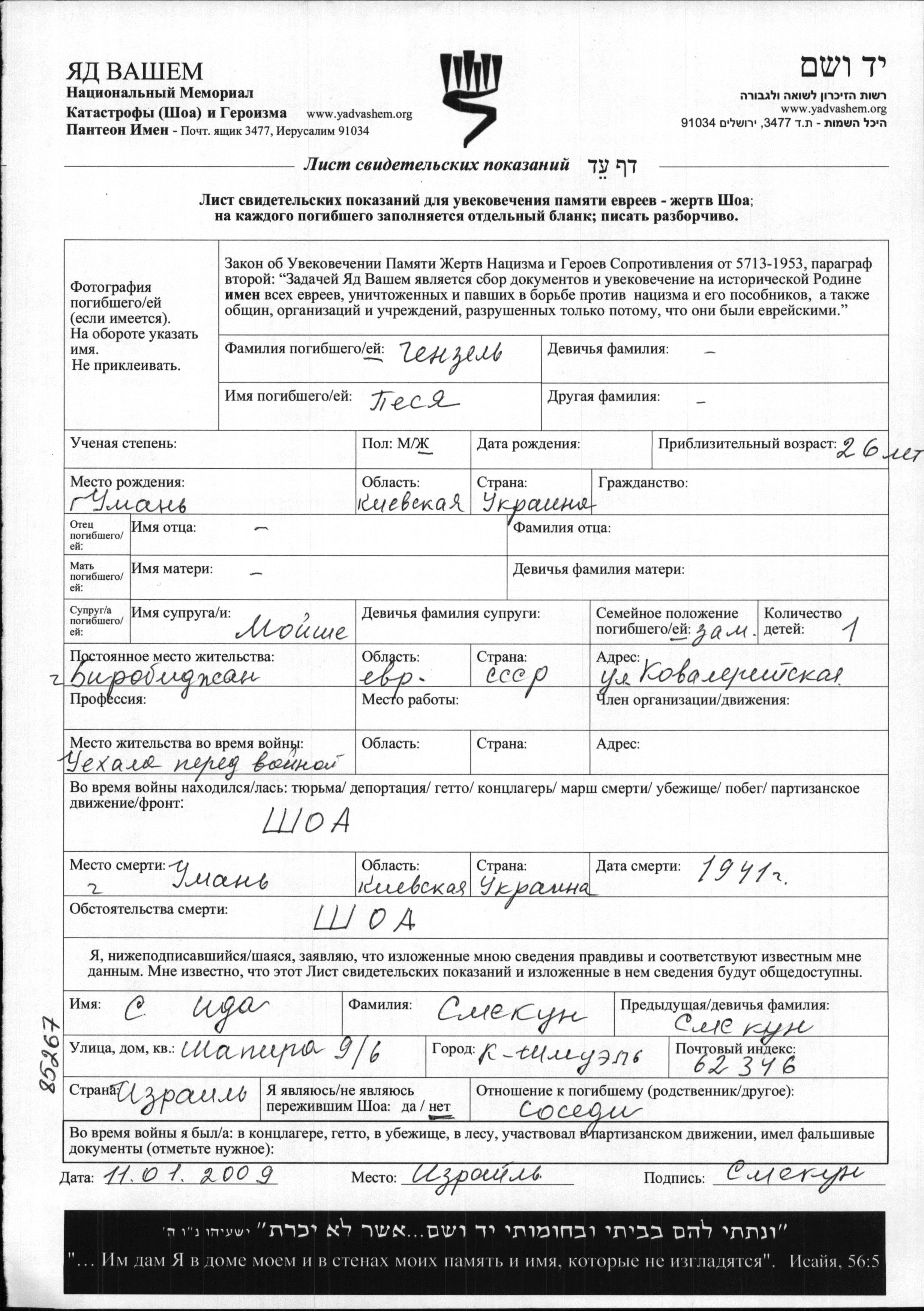 Pesya wurde in der Schoah ermordet. Todesort: Uman, Ukraine (UdSSR) im Jahr 1941.