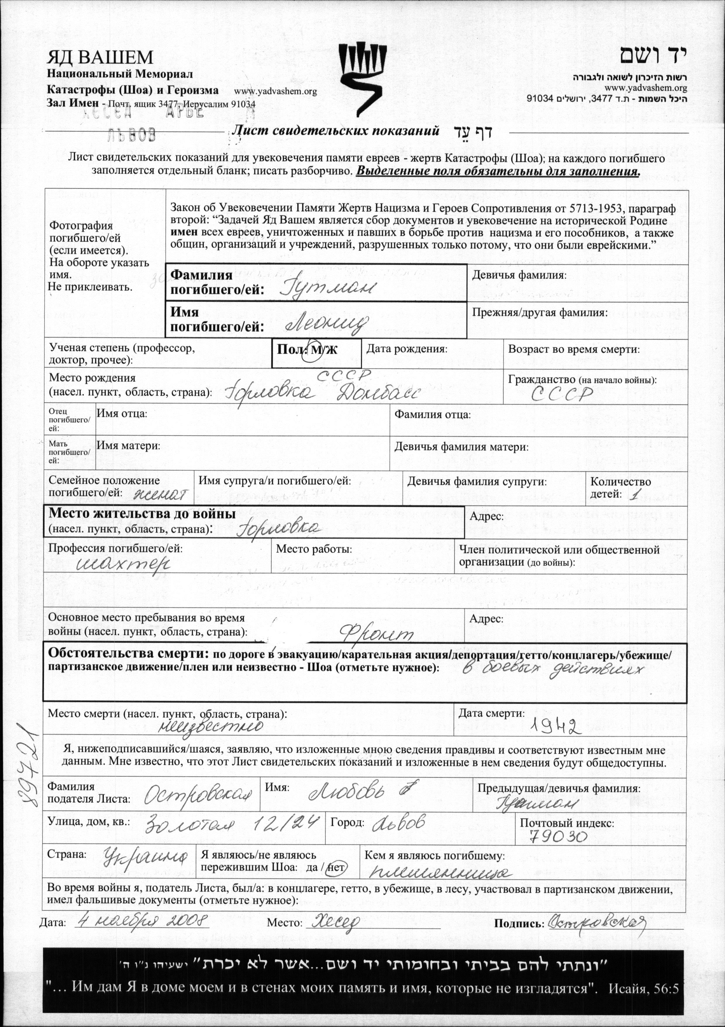 Leonid Gutman wurde in Gorlovka, Ukraine (UdSSR) geboren. Er war Shakhtyor und Verheiratet. Vor dem Zweiten Weltkrieg lebte er in Gorlovka, Ukraine (UdSSR). Während des Krieges war er in die Sowjetischen Streitkräfte.