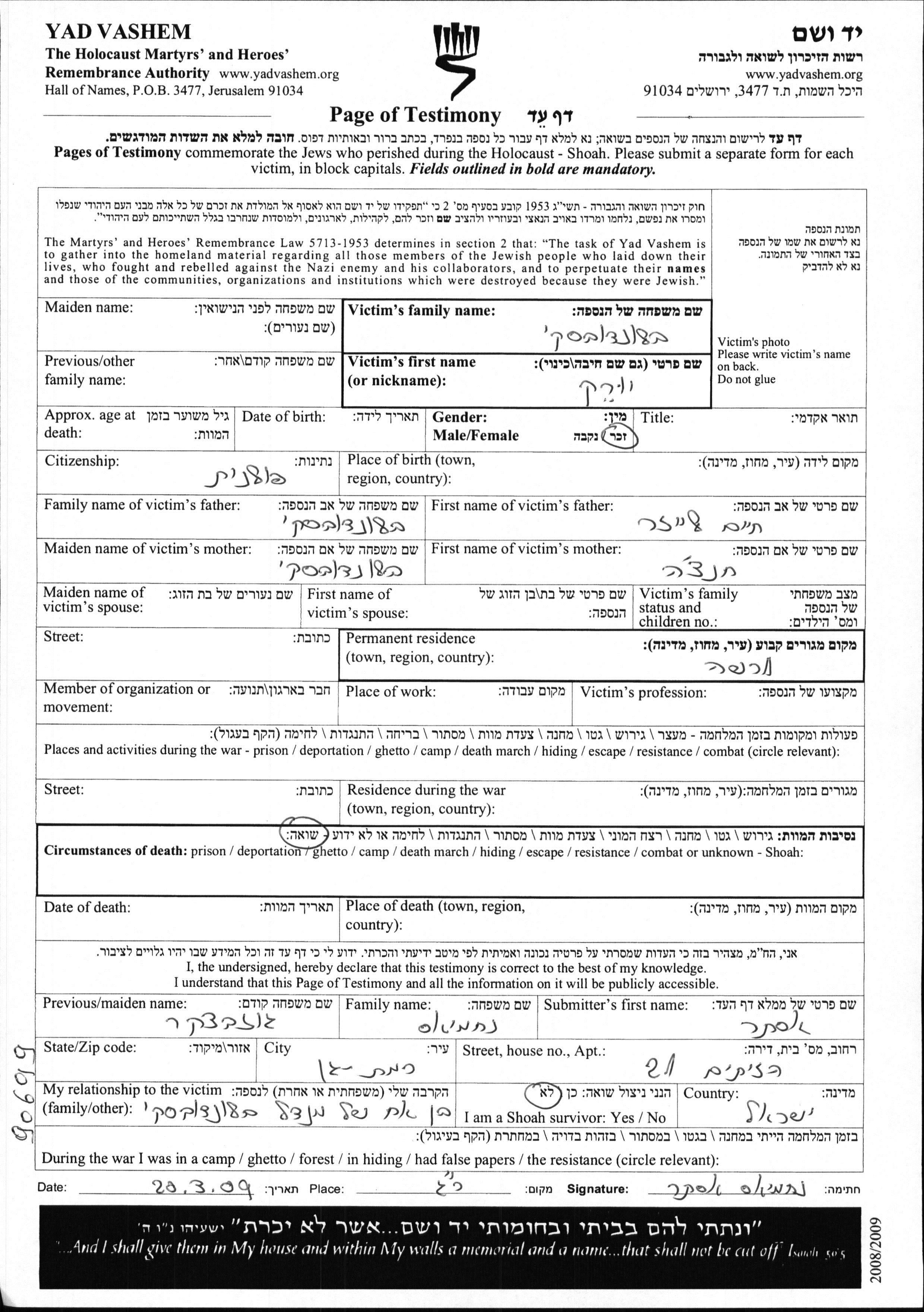 Yad Vashem - Gedenkblätter Sammlung