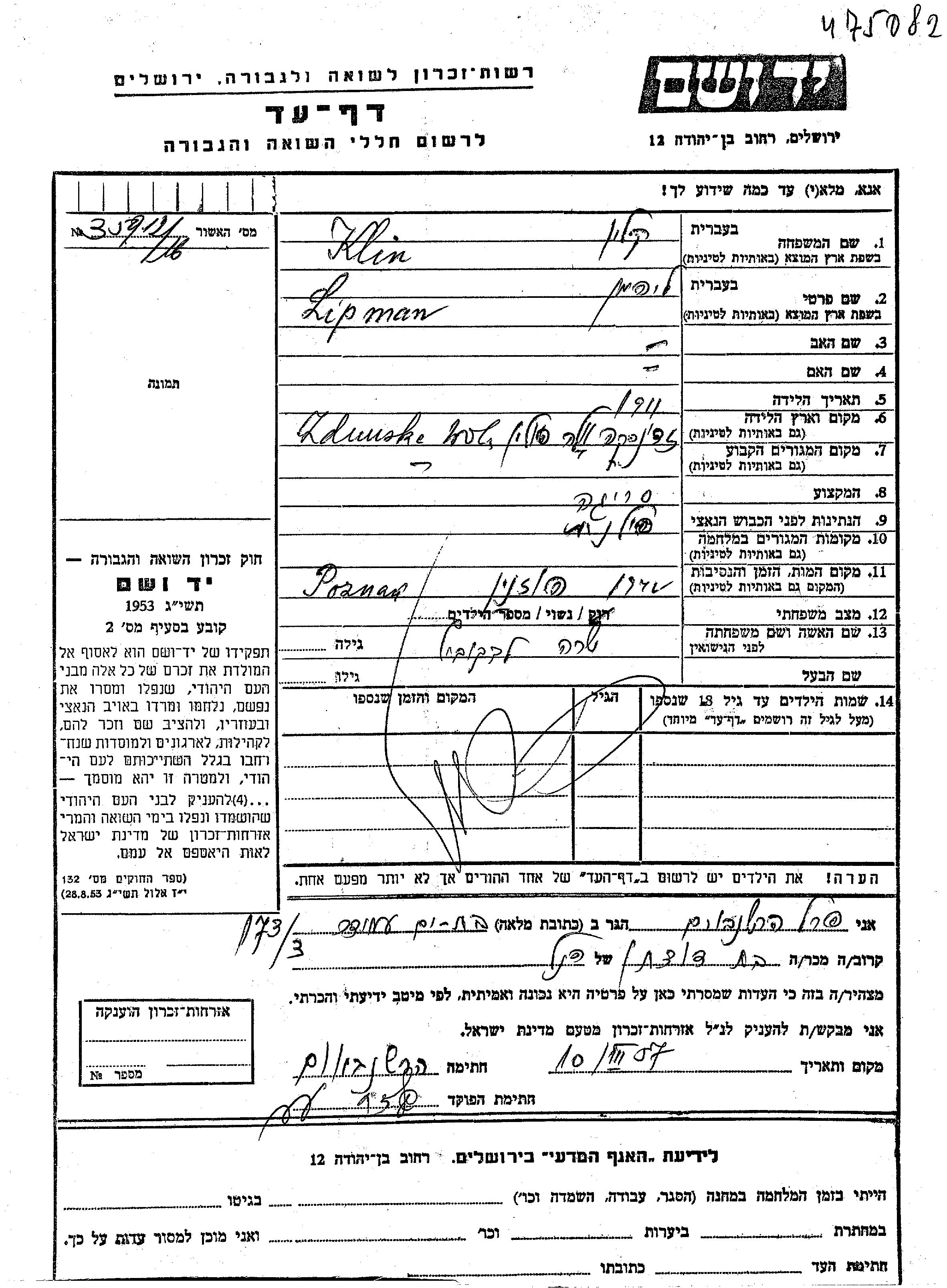 Lipman wurde in der Schoah ermordet. Todesort: Poznan, Polen im Jahr 1942.