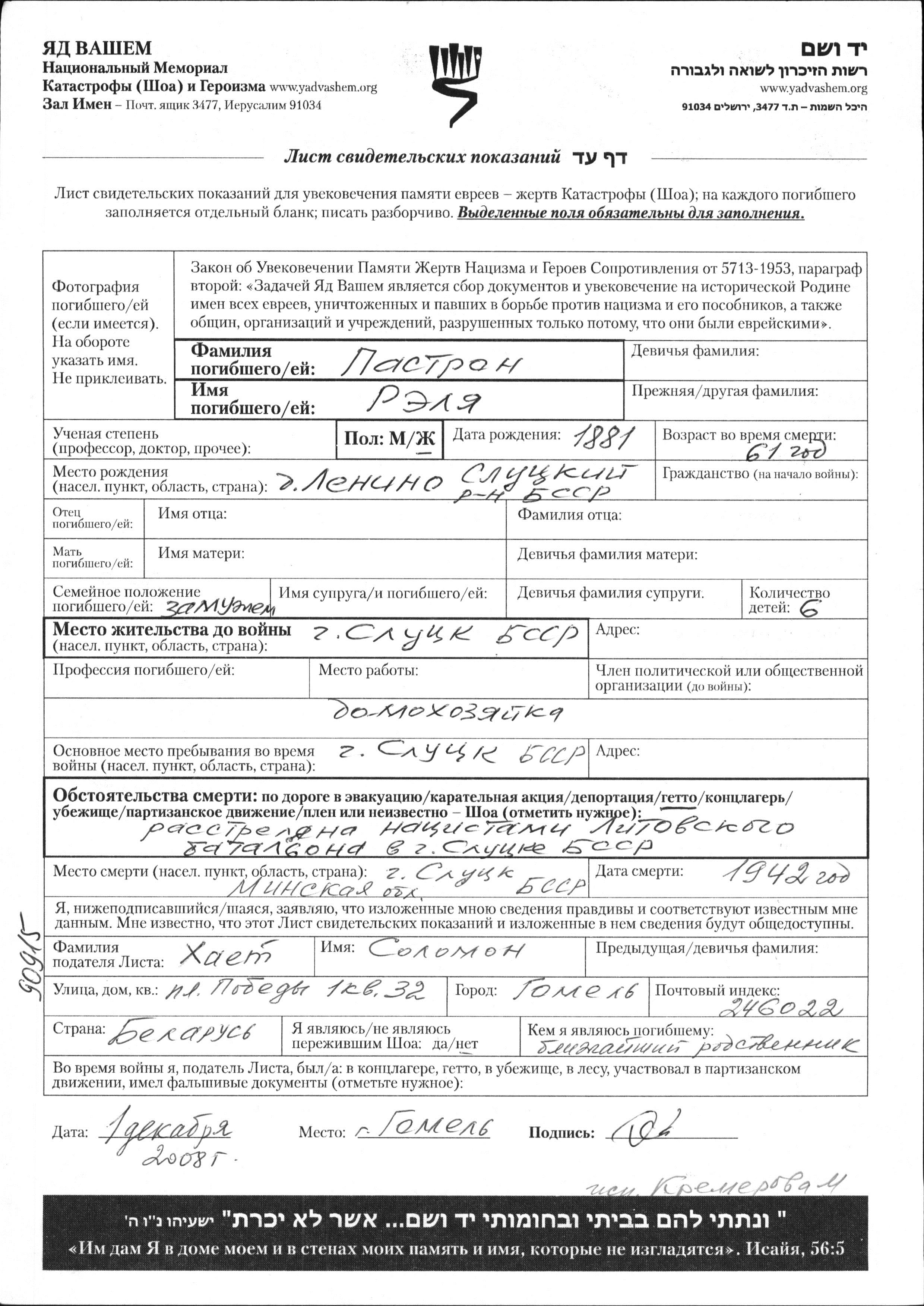 Relya Pastron wurde im Jahr 1881 in Lenino, Weißrussland (UdSSR) geboren. Sie war Hausfrau und Verheiratet. Vor dem Zweiten Weltkrieg lebte sie in Slutsk, Weißrussland (UdSSR). Während des Krieges war sie in Slutsk, Weißrussland (UdSSR).