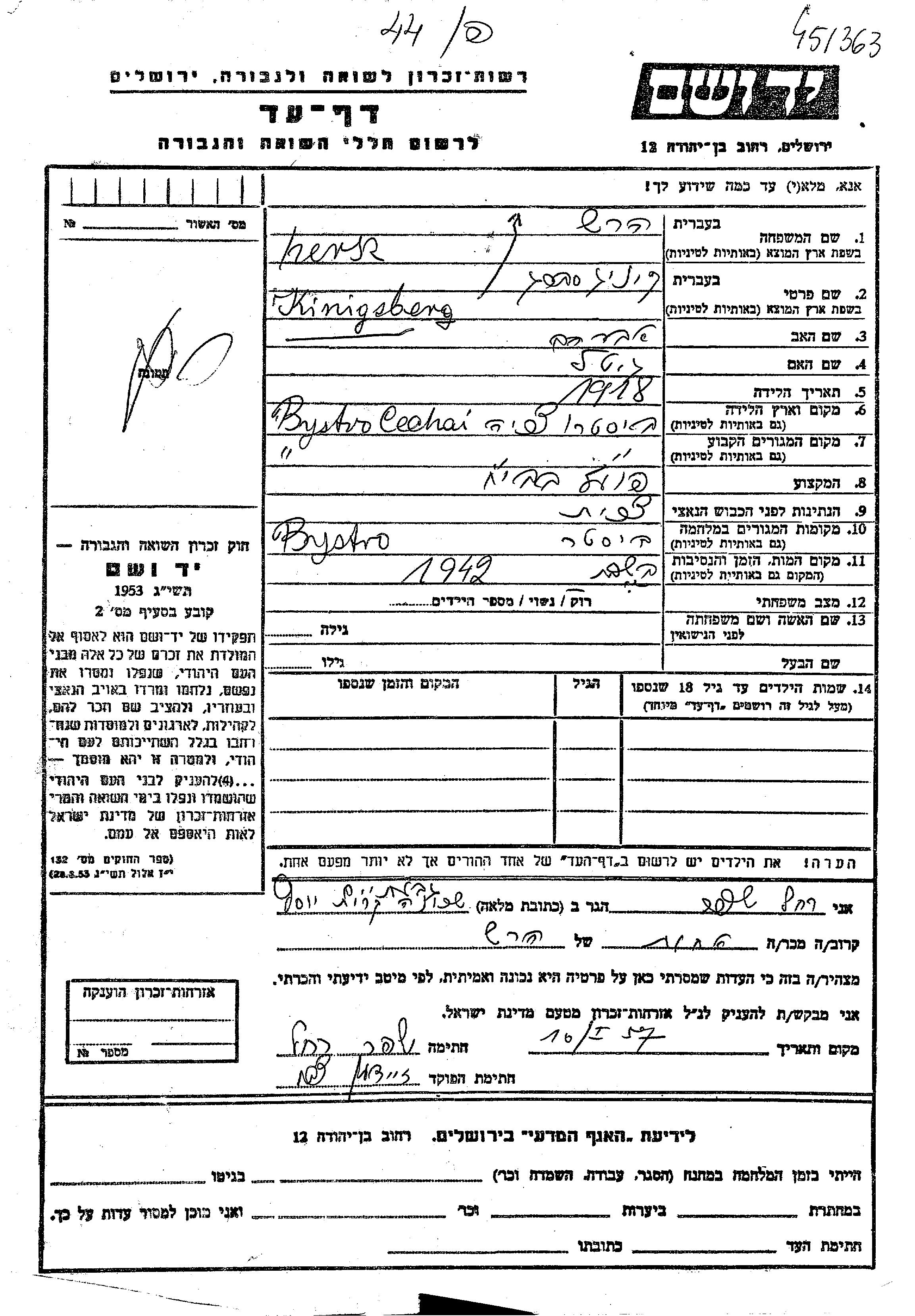 Hersz Kinigsberg wurde im Jahr 1918 in Bisztra, Tschechoslowakei geboren. Er war der Sohn von Avraham und Gitel. Er war Fabrikarbeiter / fabrikarbeiterin. Vor dem Zweiten Weltkrieg lebte er in Bisztra, Tschechoslowakei. Während des Krieges war er in Bisztra, Tschechoslowakei.