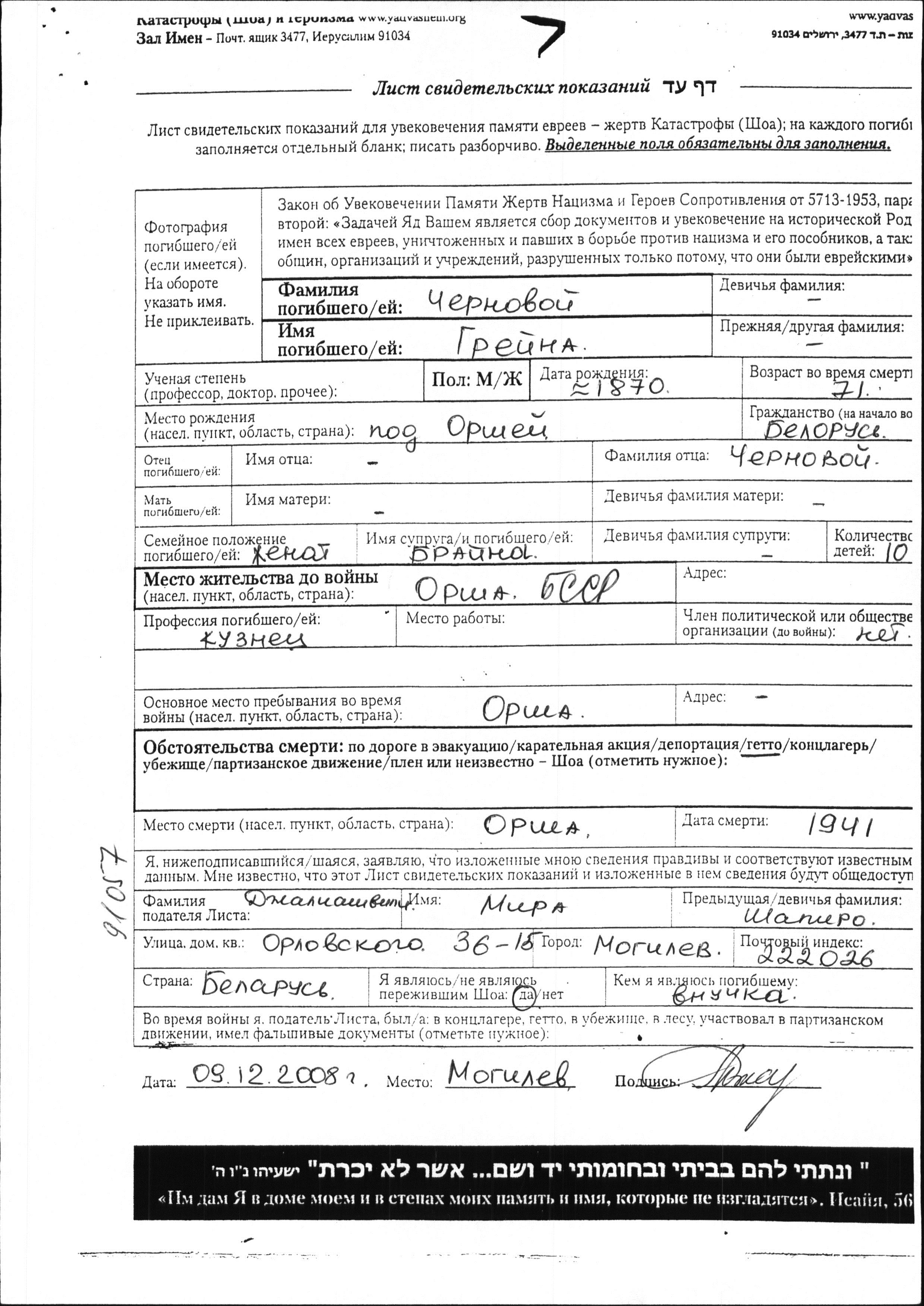 Greina Chernovoi wurde im Jahr 1870 in Orsha, Weißrussland (UdSSR) geboren. Sie war Schmied und mit Braina Verheiratet. Vor dem Zweiten Weltkrieg lebte sie in Orsha, Weißrussland (UdSSR). Während des Krieges war sie in Orsha, Weißrussland (UdSSR).