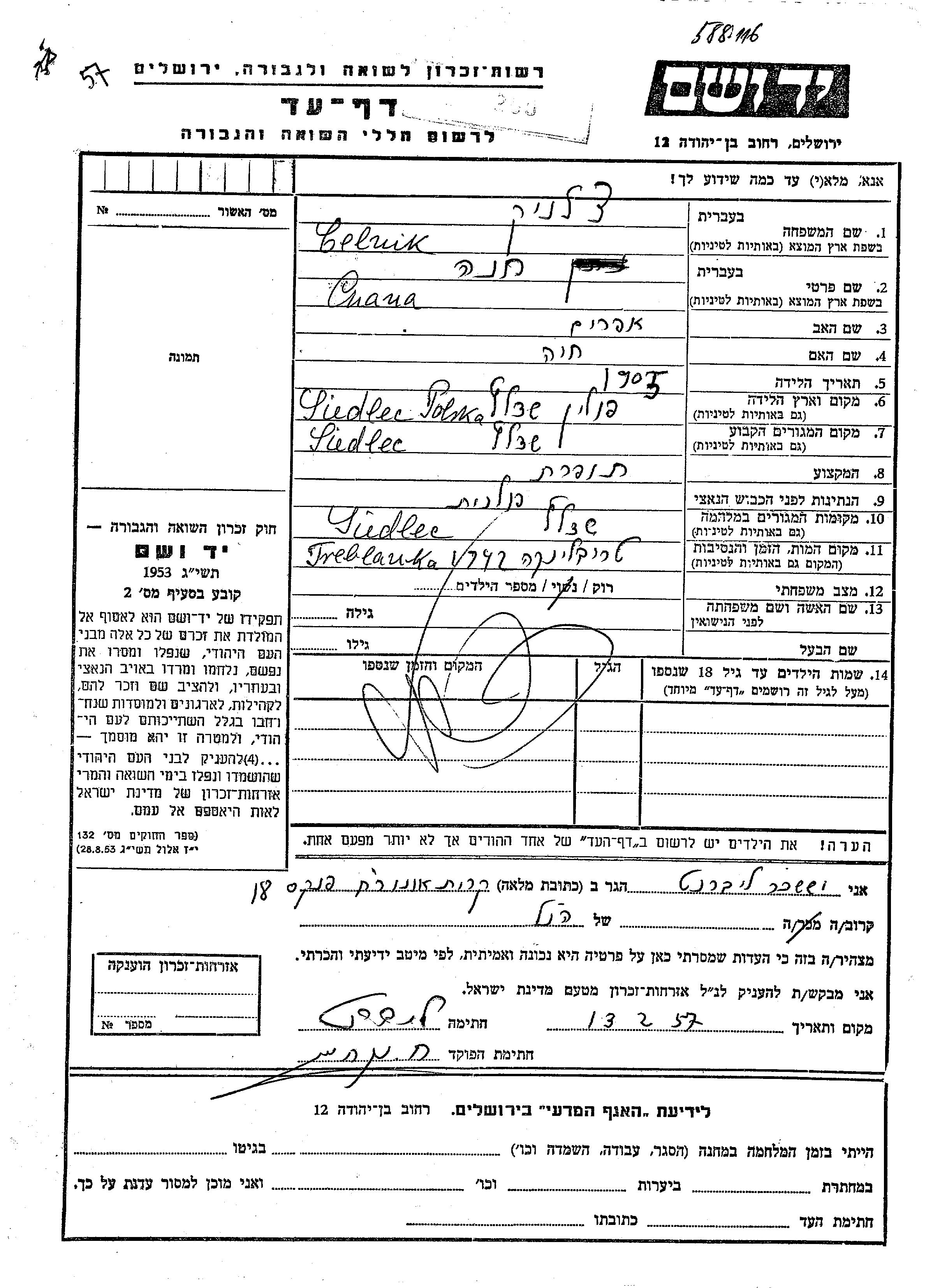 Chana Celnik wurde im Jahr 1905 in Siedlce, Polen geboren. Sie war die Tochter von Efraim und Khaia. Sie war Schneiderin und Ledig. Vor dem Zweiten Weltkrieg lebte sie in Siedlce, Polen. Während des Krieges war sie in Siedlce, Polen.