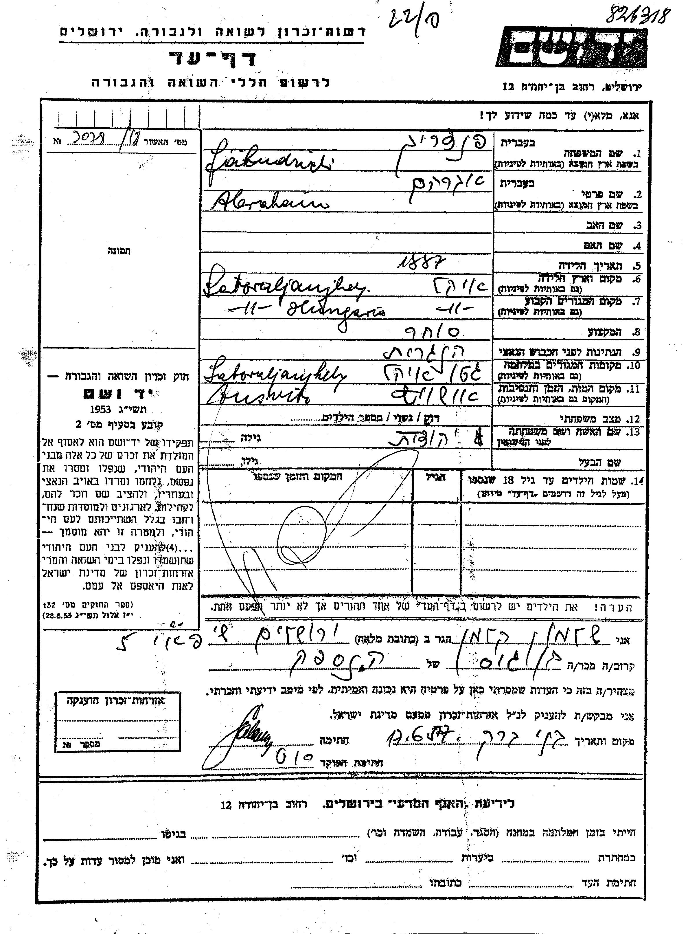 Abraham Fandrich wurde im Jahr 1887 in Satoraljaujhely, Ungarn geboren. Er war Kaufmann/-frau und mit Yehudit Verheiratet. Vor dem Zweiten Weltkrieg lebte er in Satoraljaujhely, Ungarn. Während des Krieges war er in Satoraljaujhely, Ungarn.