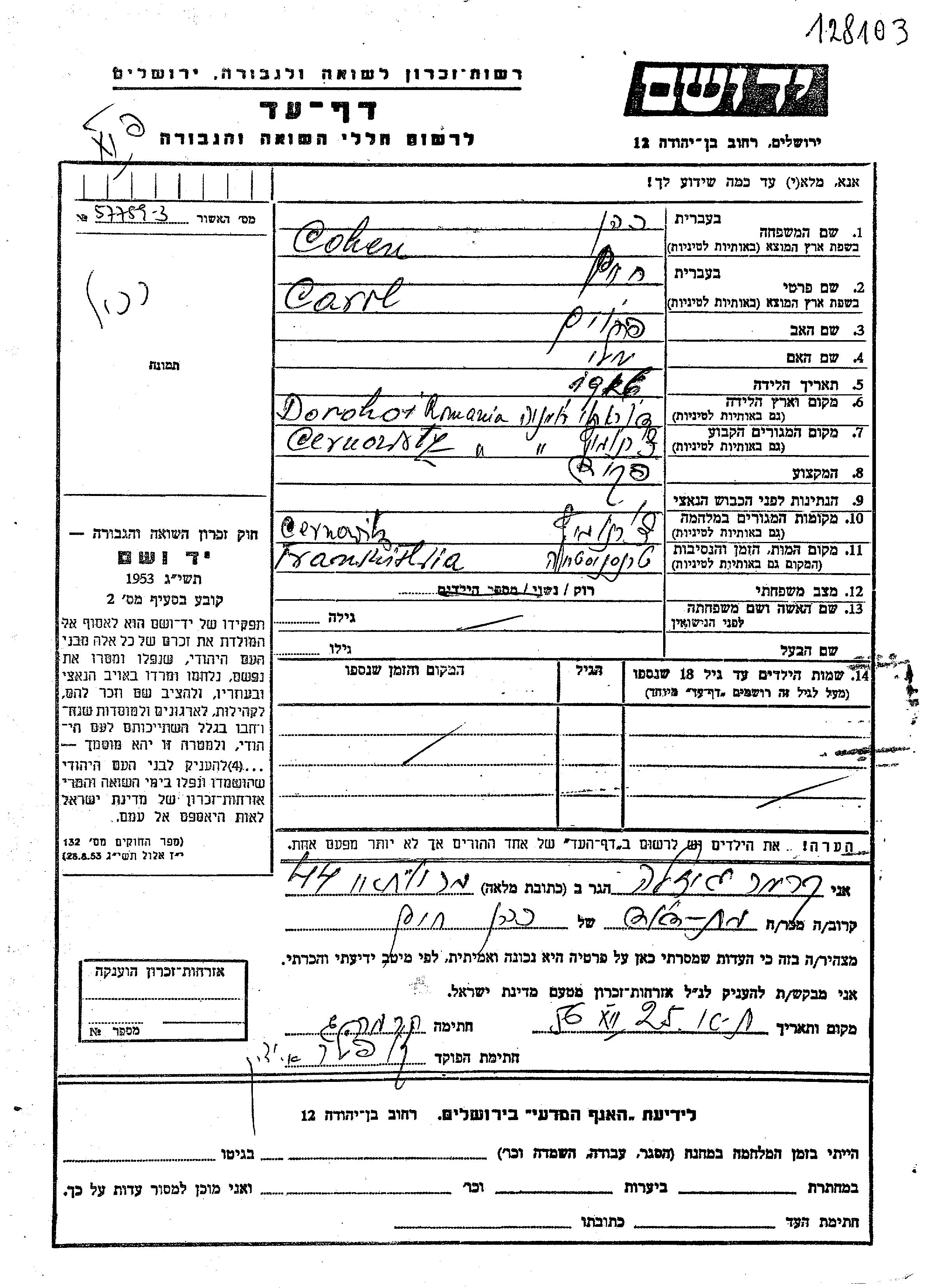 Carol Khaim Cohen wurde im Jahr 1916 in Dorohoi, Rumänien geboren. Er war der Sohn von Froim und Mali. Er war Angestellte/-r und Ledig. Vor dem Zweiten Weltkrieg lebte er in Cernauti, Rumänien. Während des Krieges war er in Cernauti, Rumänien.