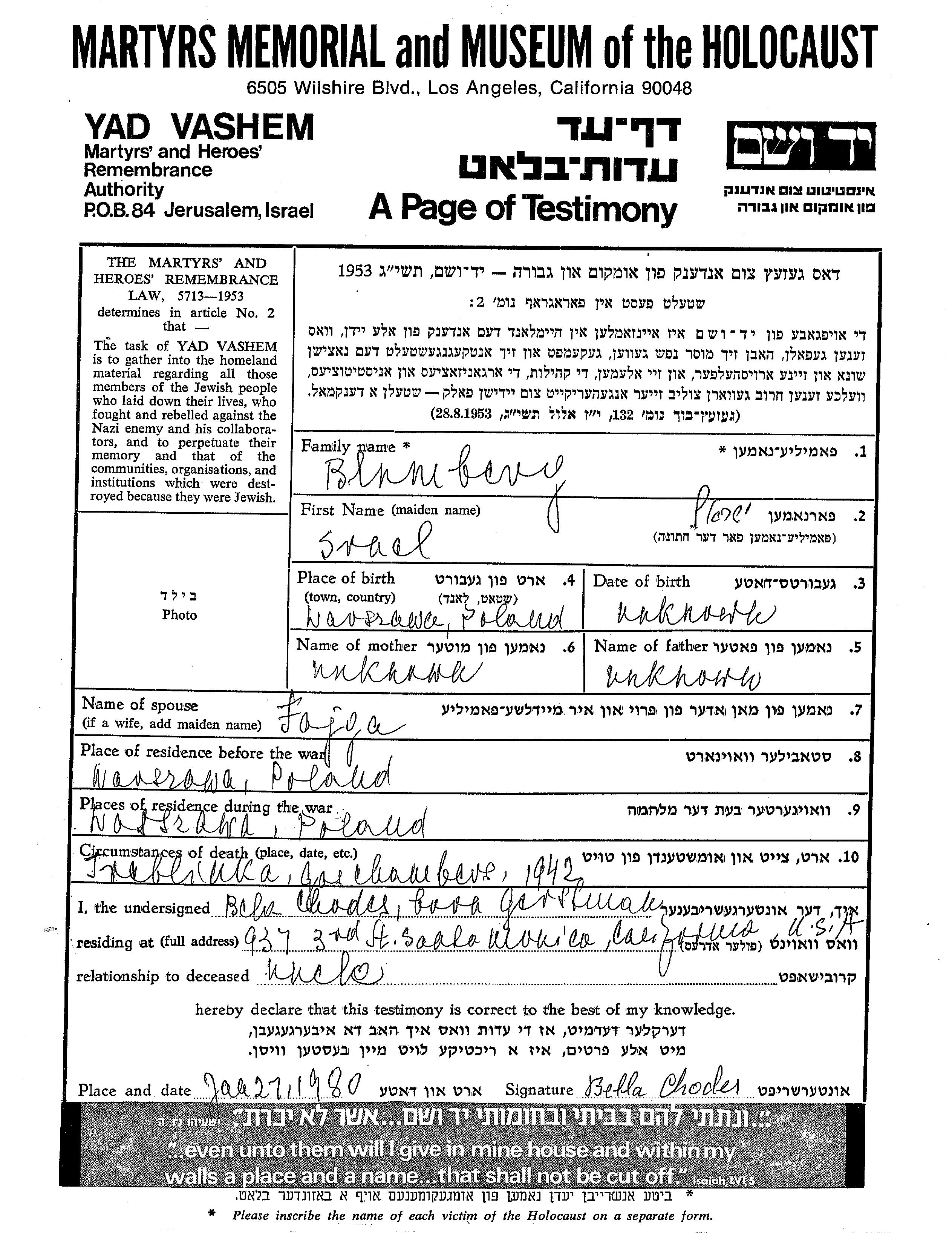 Blumberg Srael Warszawa, Polen Gedenkblatt