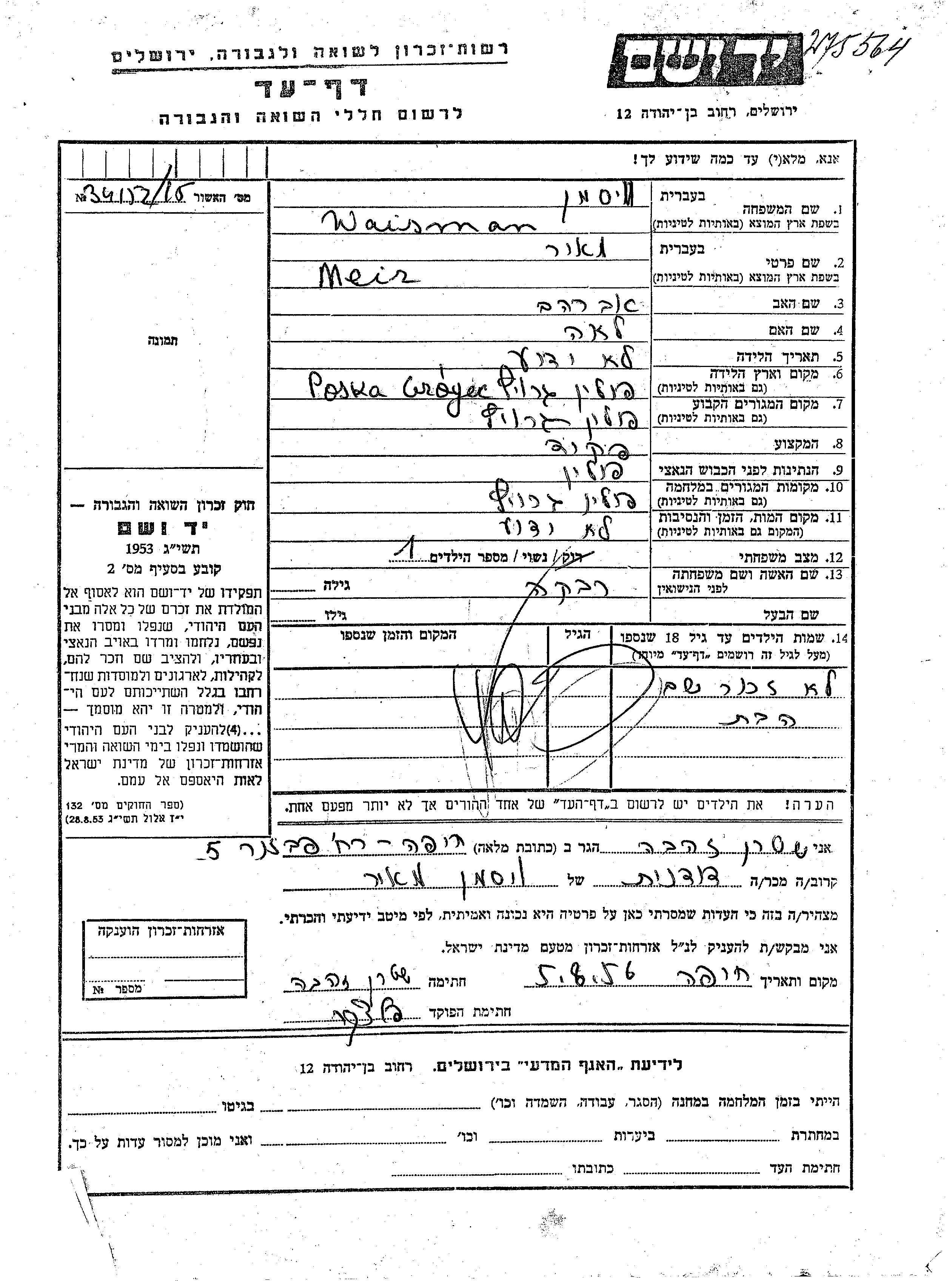 Meir Waisman wurde in Grojec, Polen geboren. Er war der Sohn von Avraham und Lea. Er war Angestellte/-r und mit Rivka Verheiratet. Vor dem Zweiten Weltkrieg lebte er in Grojec, Polen. Während des Krieges war er in Grojec, Polen.