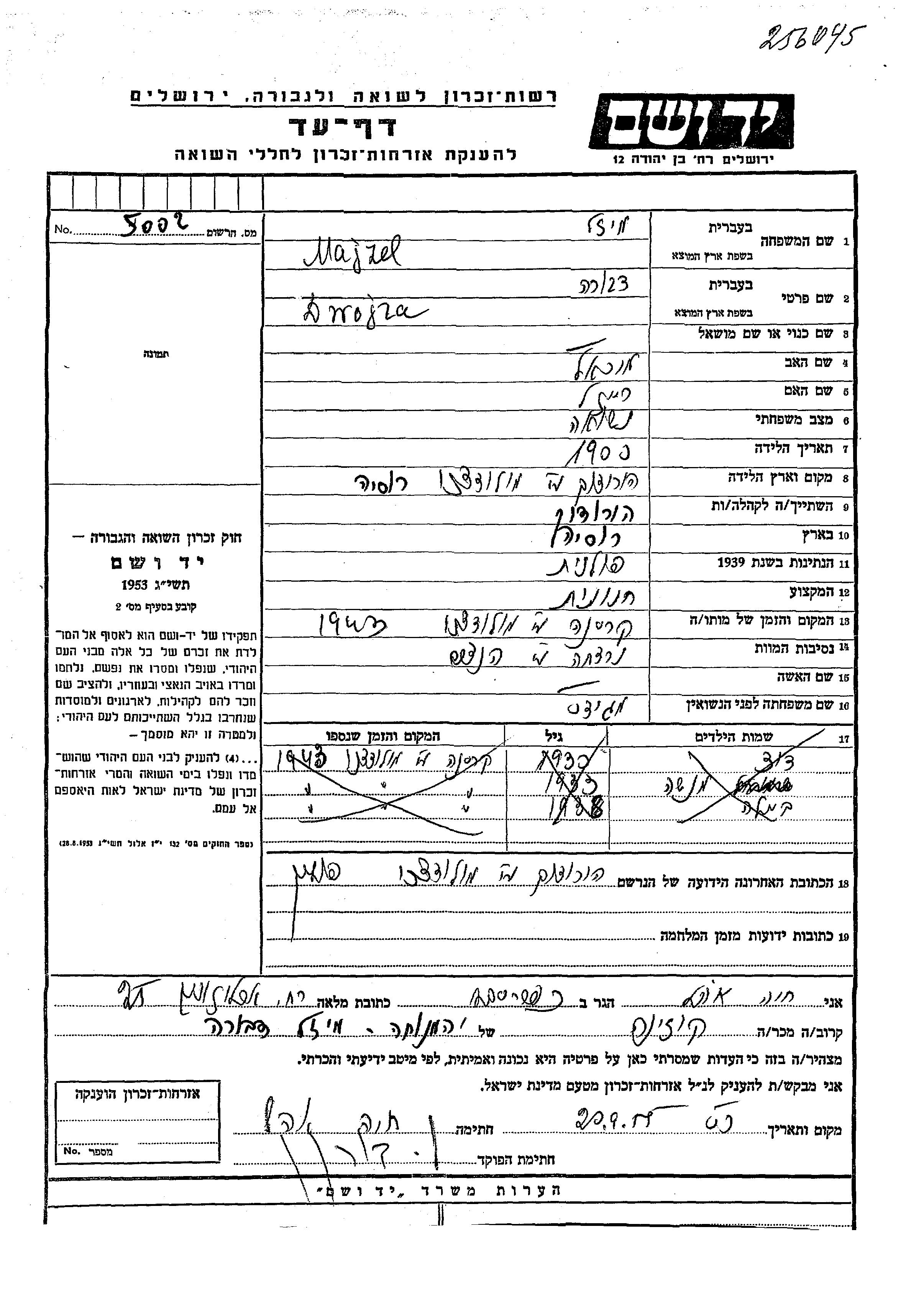 Dwojra Majzel, geb. Magids wurde im Jahr 1900 in Gorodok, Polen geboren. Sie war die Tochter von Mikhael und Reizl. Sie war Lebensmittelhändler/-in und Verheiratet. Vor dem Zweiten Weltkrieg lebte sie in Gorodok, Polen. Während des Krieges war sie in Polen.