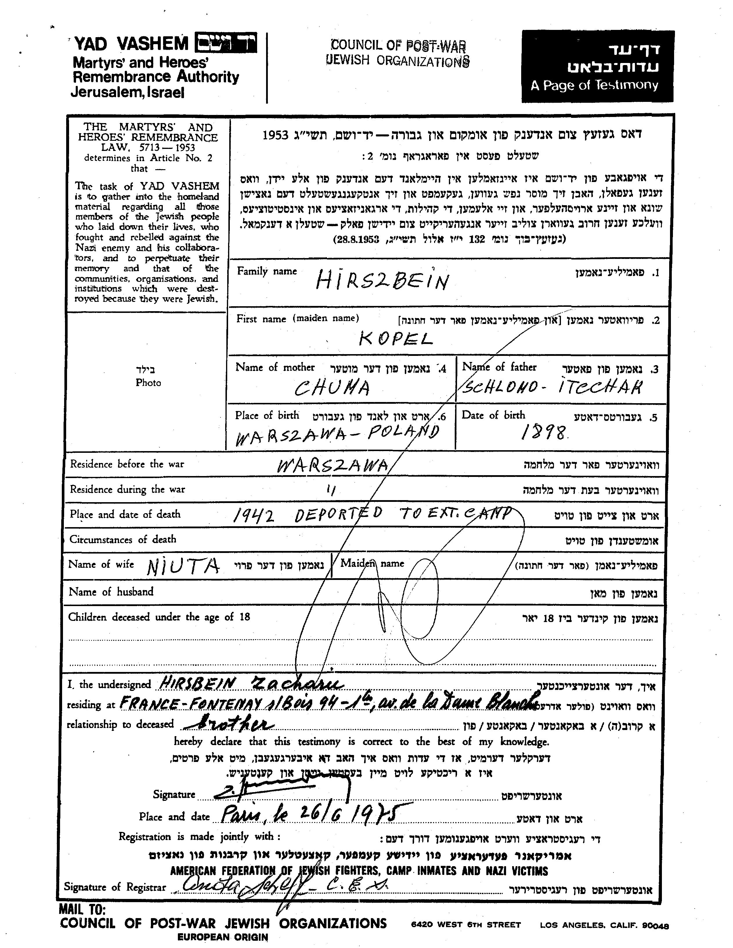 Kopel Hirszbein wurde im Jahr 1898 in Warszawa, Polen geboren. Er war der Sohn von Schlomo Itcchak und Chuma. Er war mit Niuta Verheiratet. Vor dem Zweiten Weltkrieg lebte er in Warszawa, Polen. Während des Krieges war er in Warszawa, Polen.