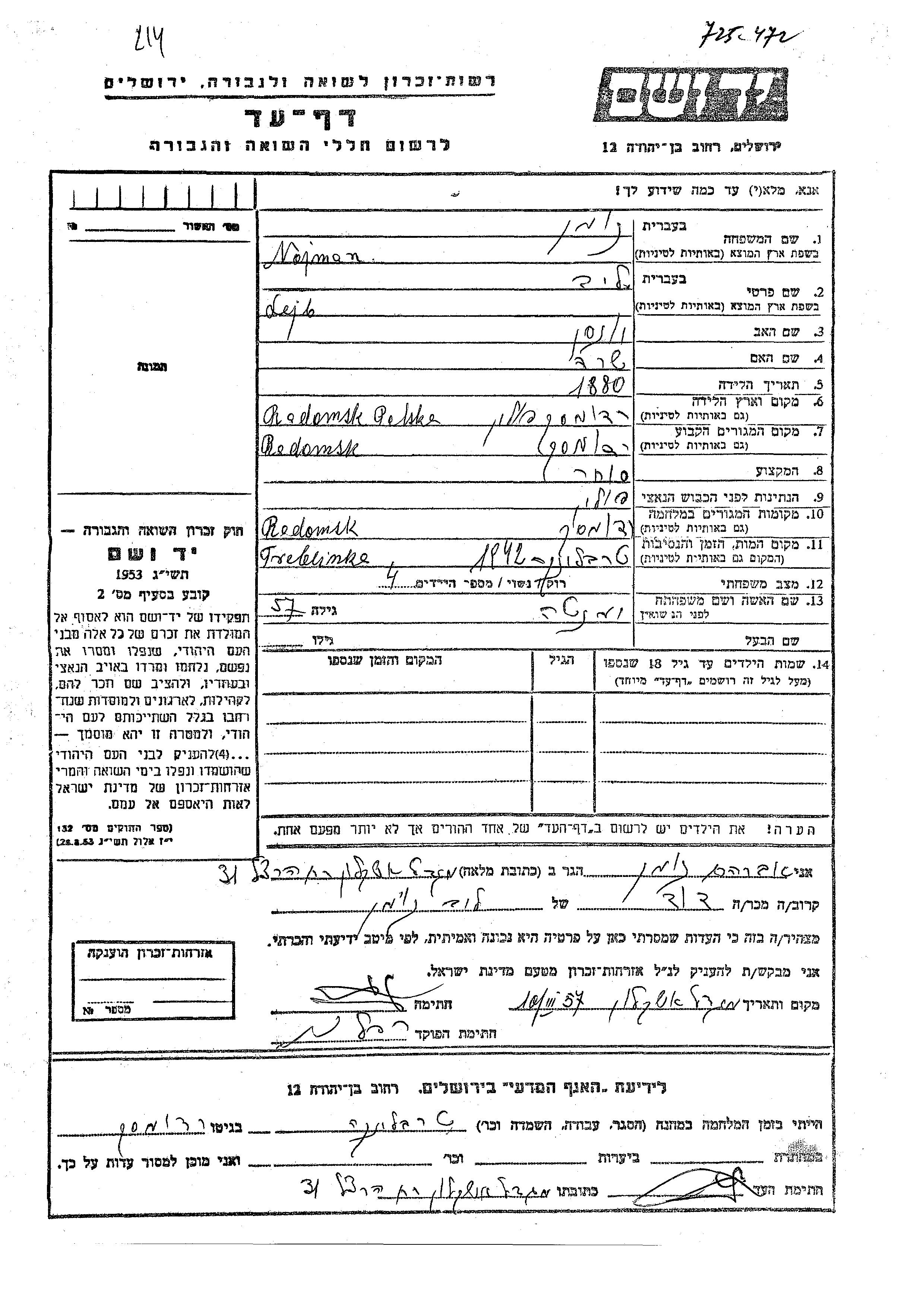 Lejb Nojman wurde im Jahr 1880 in Radomsko, Polen geboren. Er war der Sohn von Yonson und Sara. Er war Kaufmann/-frau und mit Yenta Verheiratet. Vor dem Zweiten Weltkrieg lebte er in Radomsko, Polen. Während des Krieges war er in Radomsko, Polen.