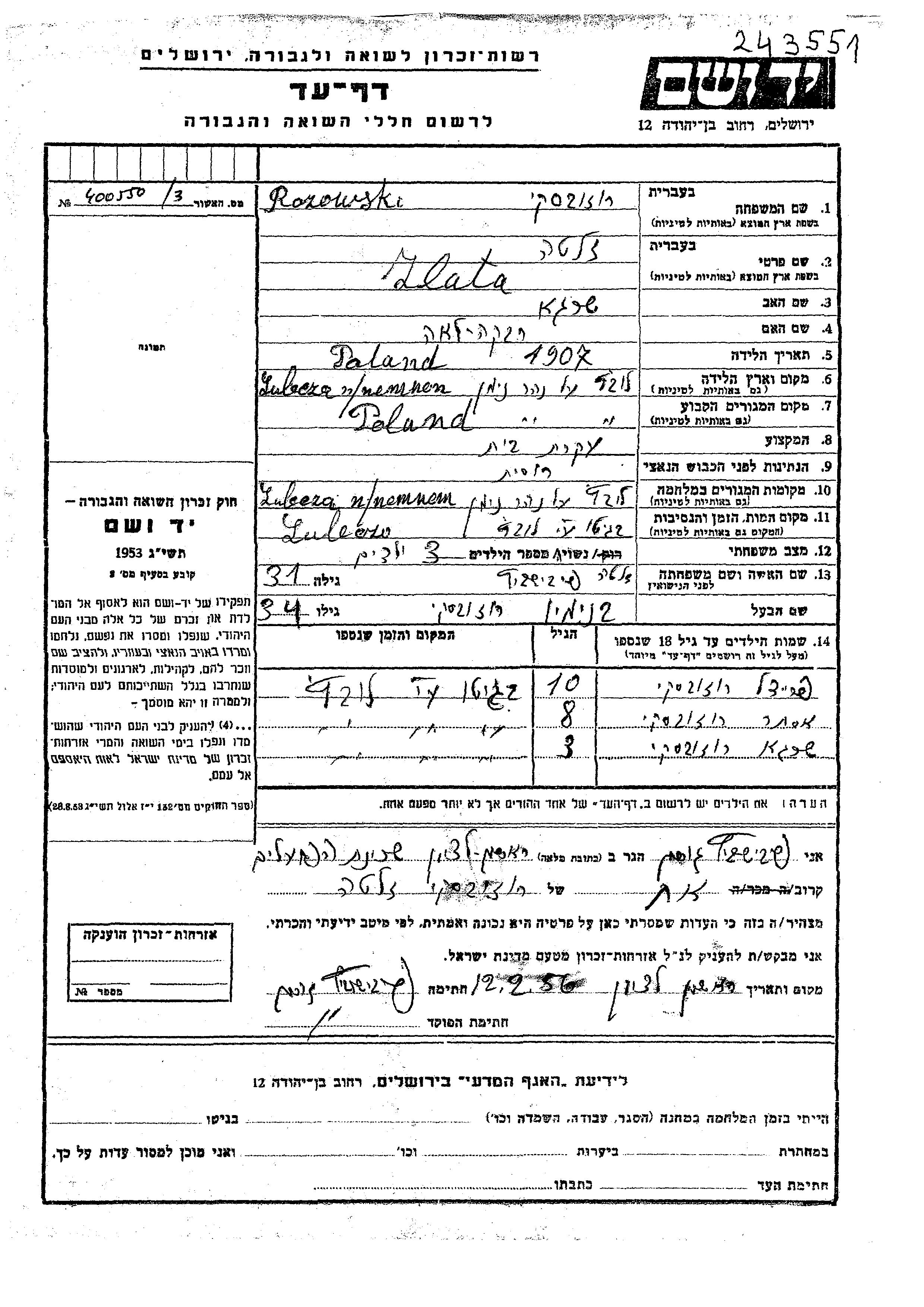 Zlata Rozowski, geb. Feivushovitz wurde im Jahr 1907 in Lubcza na Niemnem, Polen geboren. Sie war die Tochter von Shraga und Rivka Lea. Sie war Hausfrau und mit Beniamin Verheiratet. Vor dem Zweiten Weltkrieg lebte sie in Lubcza na Niemnem, Polen. Während des Krieges war sie in Lubcza na Niemnem, Polen.