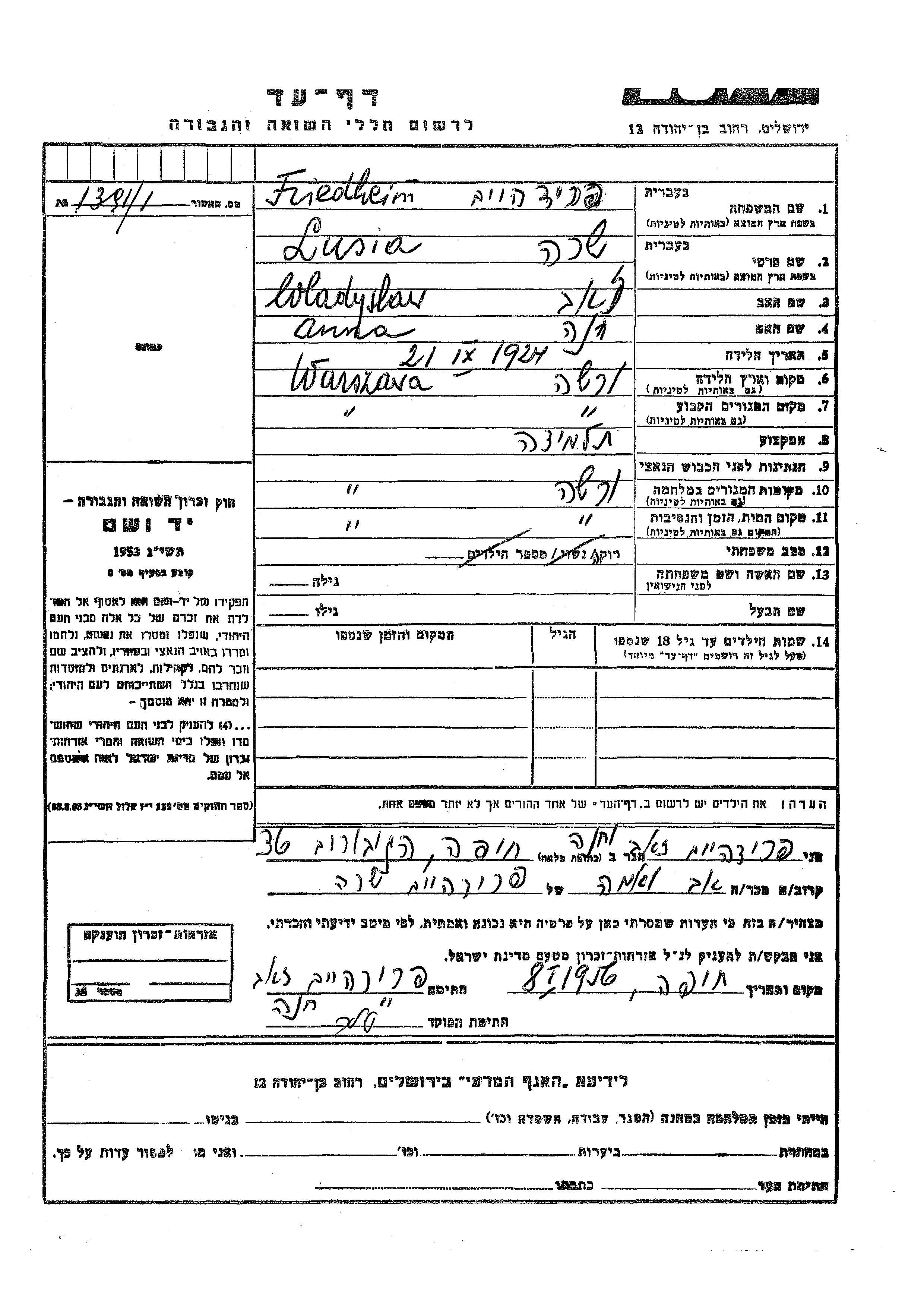 Lusia Sara Friedheim wurde im Jahr 1924 in Warszawa, Polen geboren. Sie war die Tochter von Wladyslaw Zeev und Anna Khana. Sie war Schüler/-in und Ledig. Vor dem Zweiten Weltkrieg lebte sie in Warszawa, Polen. Während des Krieges war sie in Warszawa, Polen.