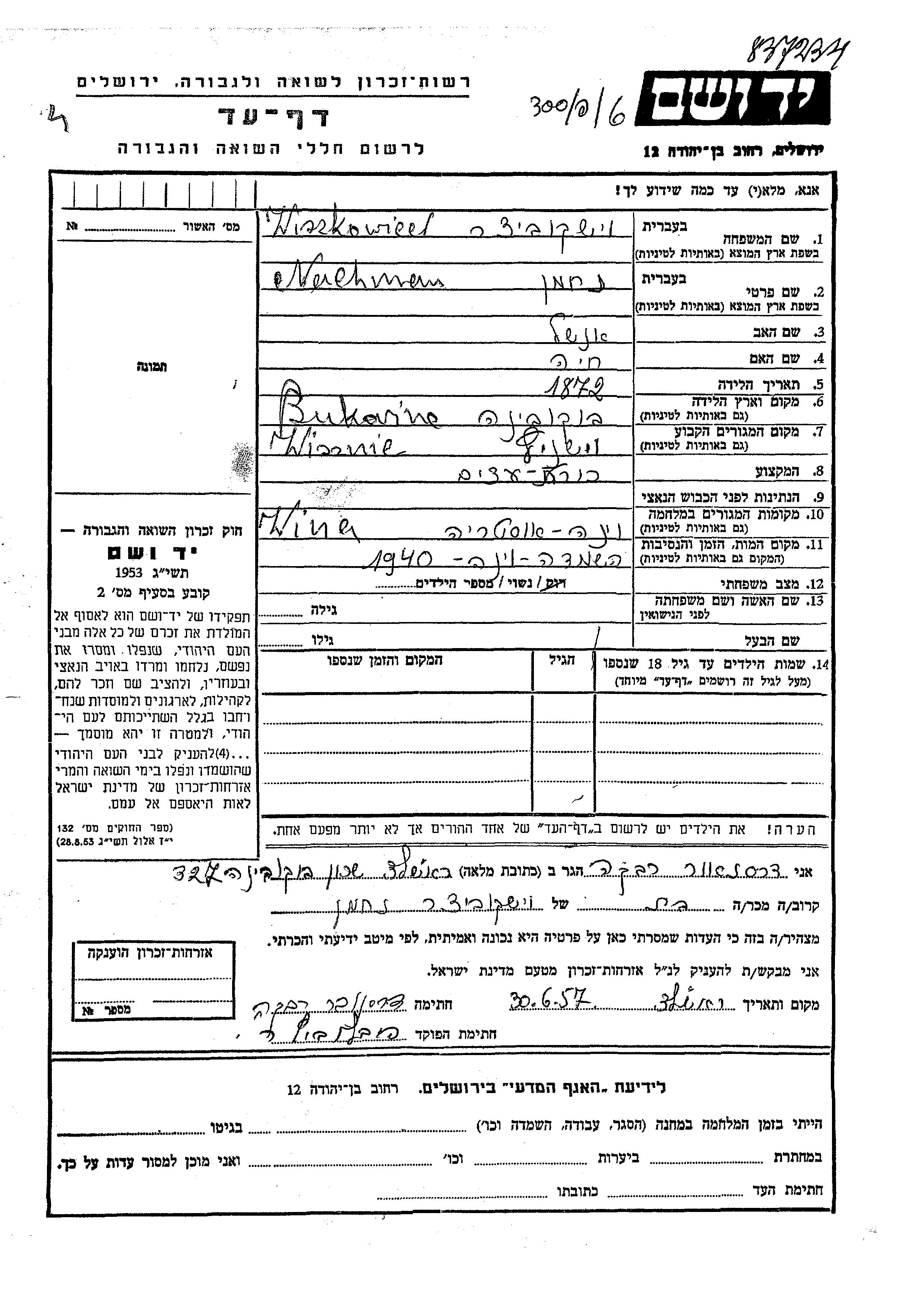 Nachman Wiszkowicer wurde im Jahr 1872 in Bukovina, Rumänien geboren. Er war der Sohn von Anshel und Khaia. Er war Holzhacker und Ledig. Vor dem Zweiten Weltkrieg lebte er in Vijnita, Rumänien. Während des Krieges war er in Vienna, Österreich.