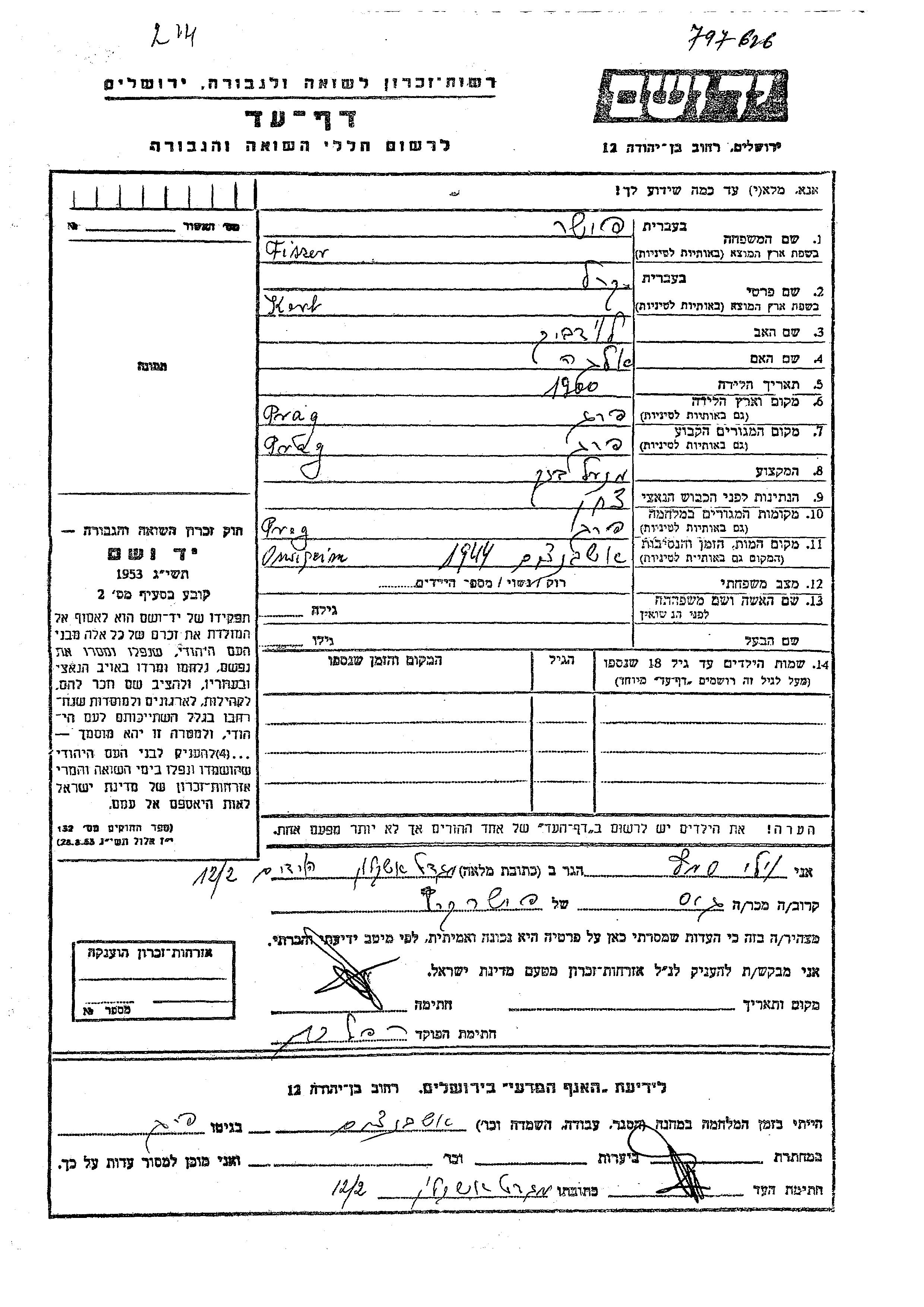 Karl Fiszer wurde im Jahr 1900 in Prag, Tschechoslowakei geboren. Er war der Sohn von Luidvik und Olga. Er war Bankdirektor. Vor dem Zweiten Weltkrieg lebte er in Prag, Tschechoslowakei. Während des Krieges war er in Prag, Tschechoslowakei.