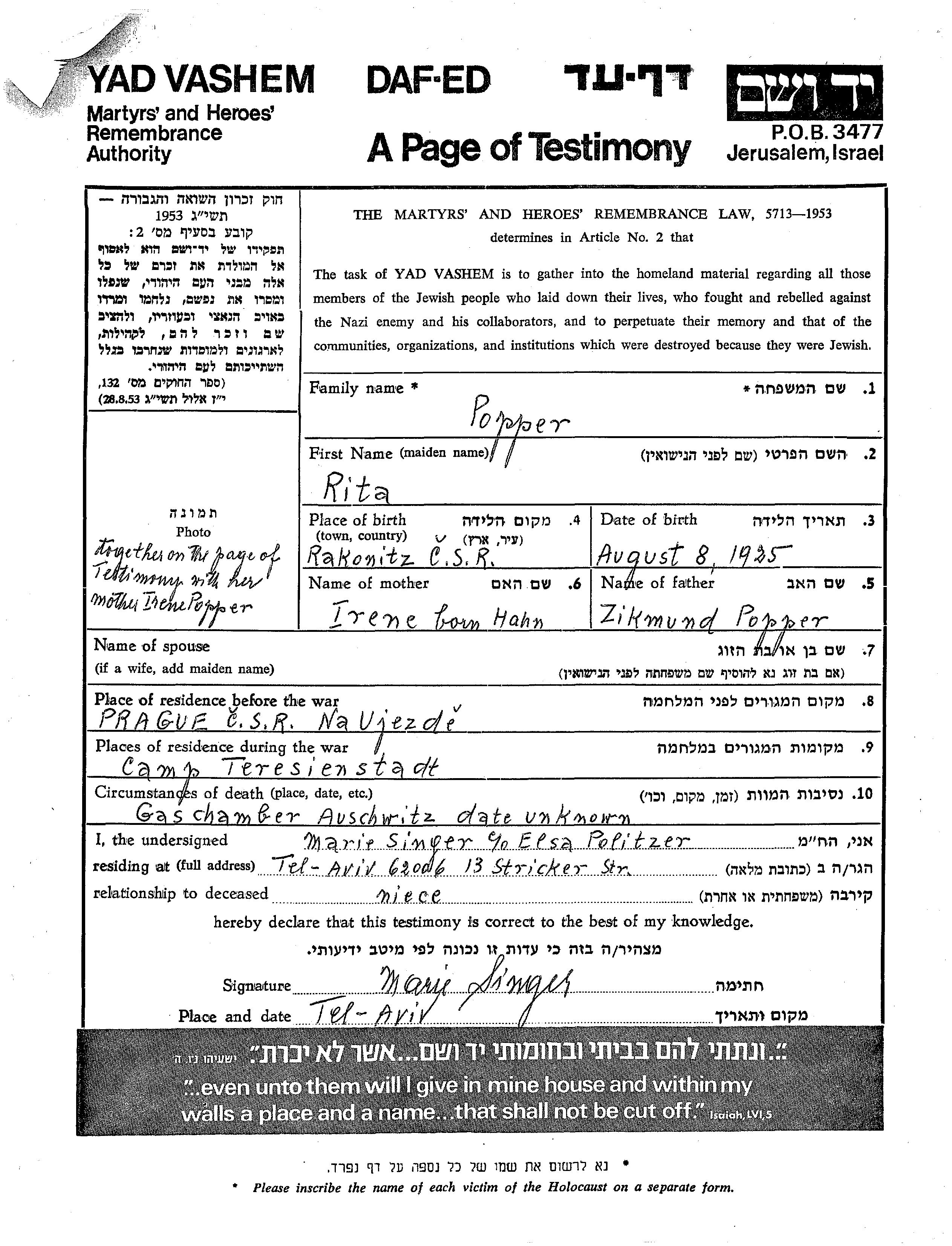 Rita Popper wurde im Jahr 1925 in Rakonitz, Tschechoslowakei geboren. Sie war die Tochter von Zikmund und Irene. Vor dem Zweiten Weltkrieg lebte sie in Prague, Tschechoslowakei. Während des Krieges war sie in Auschwitz, Polen.