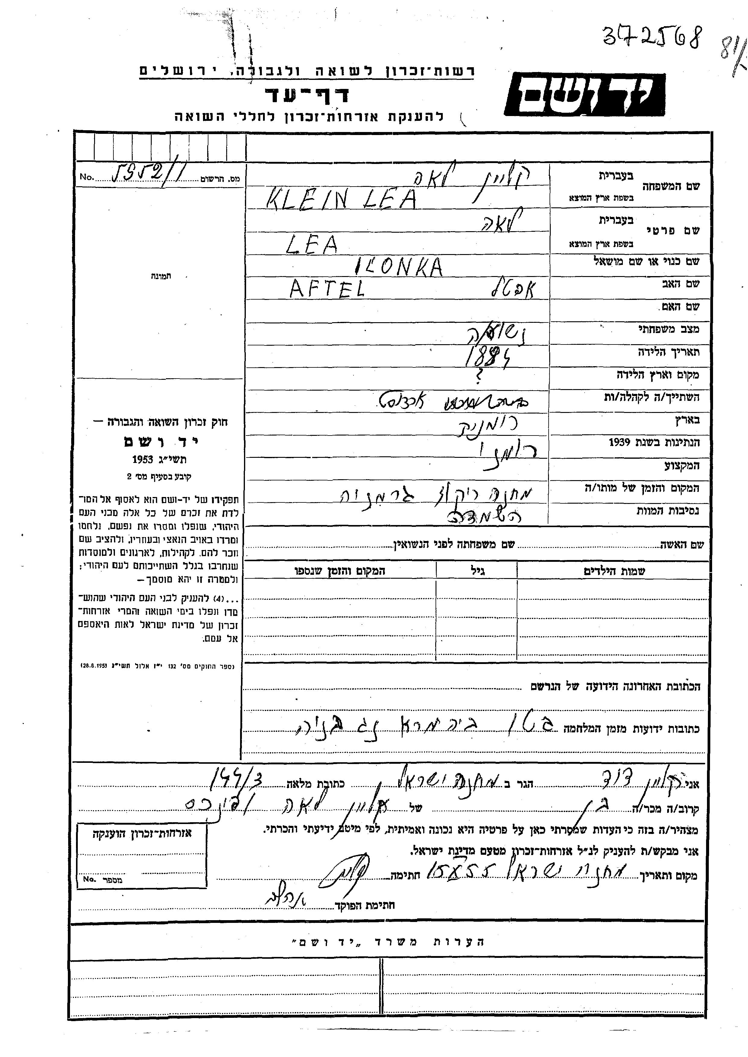 Ilonka Lea Klein, geb. Aftel wurde im Jahr 1884 geboren. Sie war Verheiratet. Vor dem Zweiten Weltkrieg lebte sie in Erd, Ungarn. Während des Krieges war sie in Baia Mare, Rumänien.