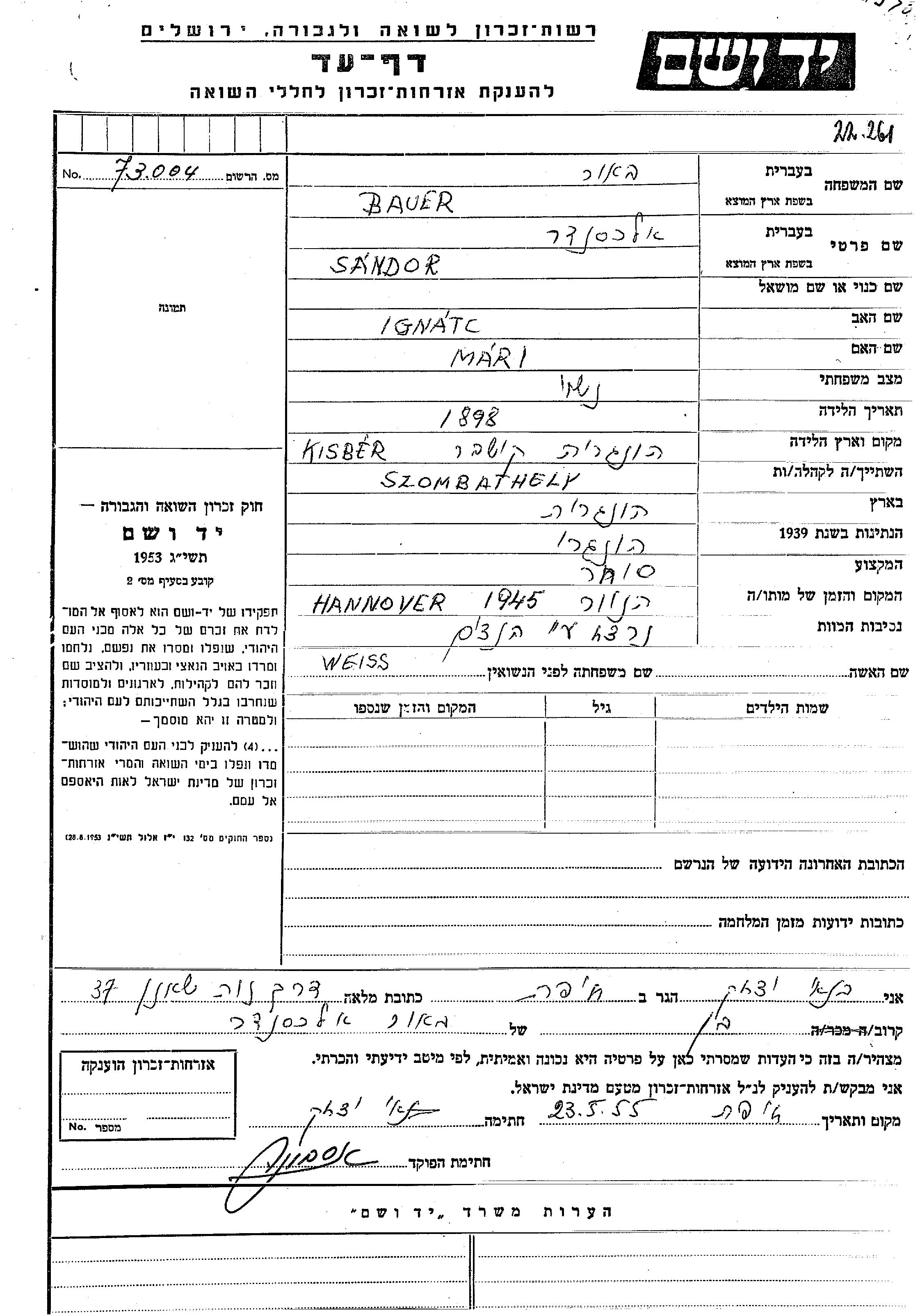 Sandor Bauer wurde im Jahr 1898 in Kisber, Ungarn geboren. Er war der Sohn von Ignatc und Mari. Er war Kaufmann/-frau und Verheiratet. Vor dem Zweiten Weltkrieg lebte er in Szombathely, Ungarn.
