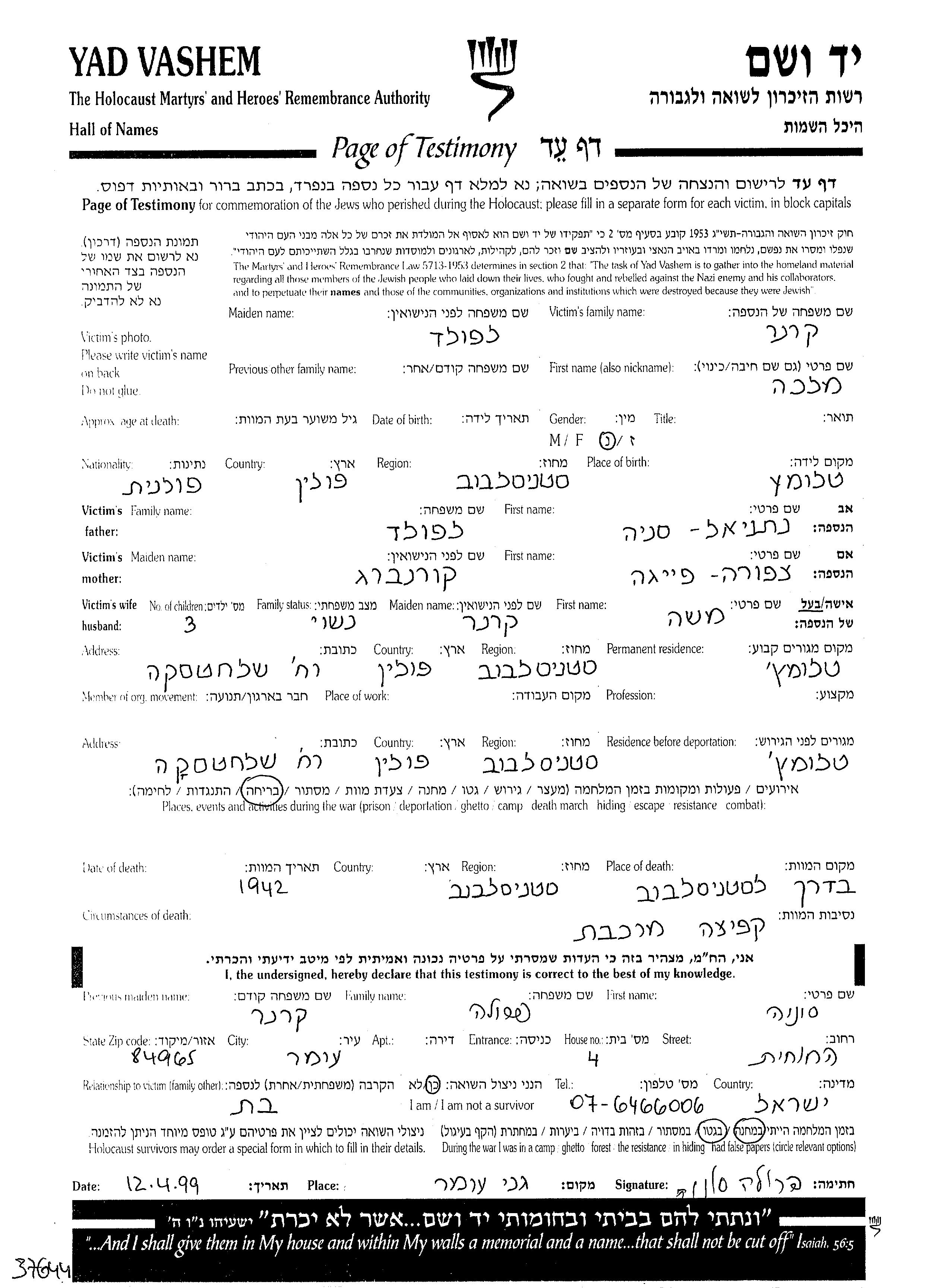Malka Kerner wurde im Jahr 1900 in Tlumach, Polen geboren. Sie war die Tochter von Natanel und Feiga. Sie war Hausfrau und Verheiratet. Vor dem Zweiten Weltkrieg lebte sie in Tlumach, Polen. Während des Krieges war sie in Tlumach, Polen.