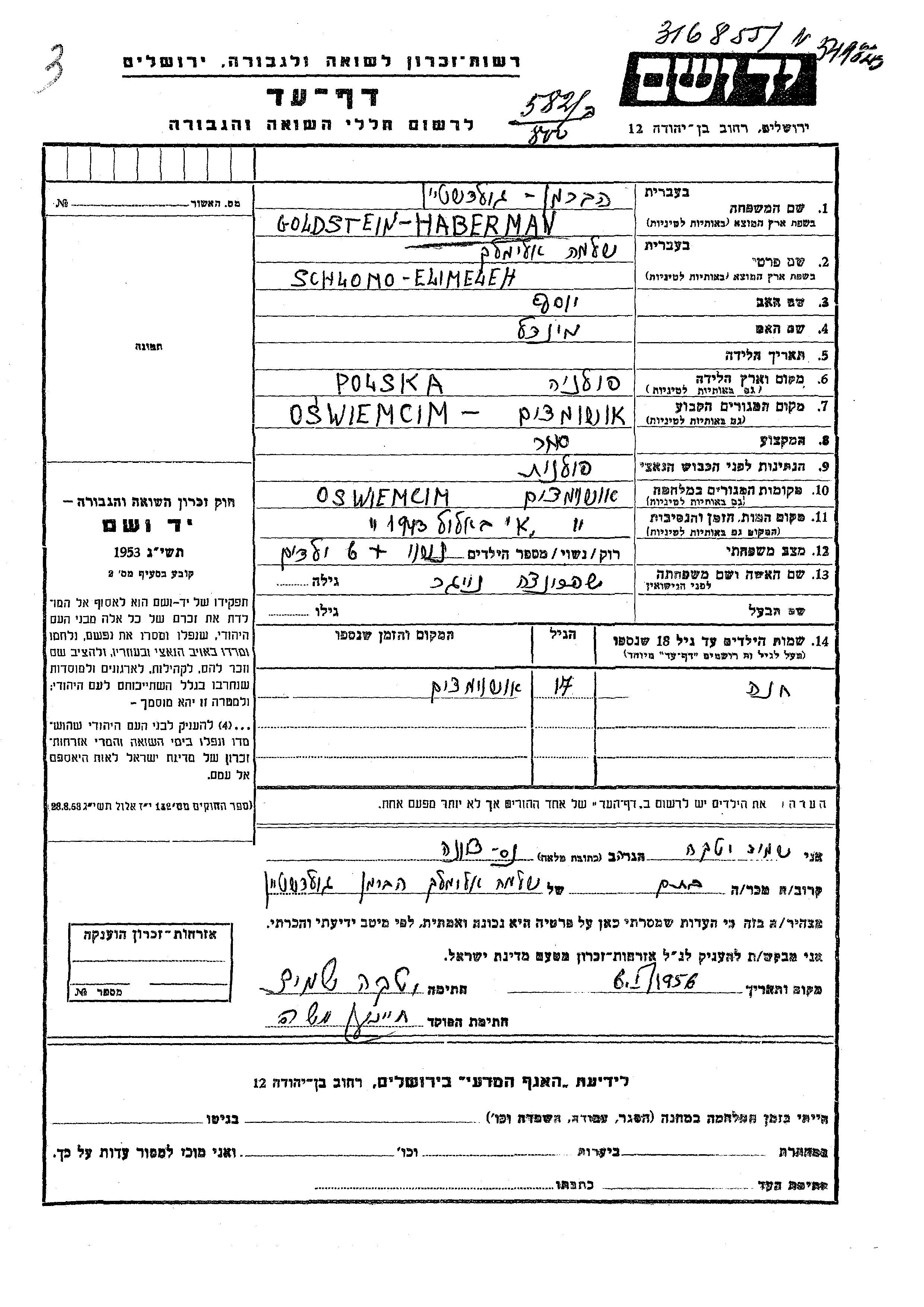 Schlomo Elimeleh Goldstein Haberman wurde in Polen geboren. Er war der Sohn von Yosef und Mindl. Er war Kaufmann/-frau und mit Shprintza, geb. Neiger Verheiratet. Vor dem Zweiten Weltkrieg lebte er in Auschwitz, Polen. Während des Krieges war er in Auschwitz, Polen.