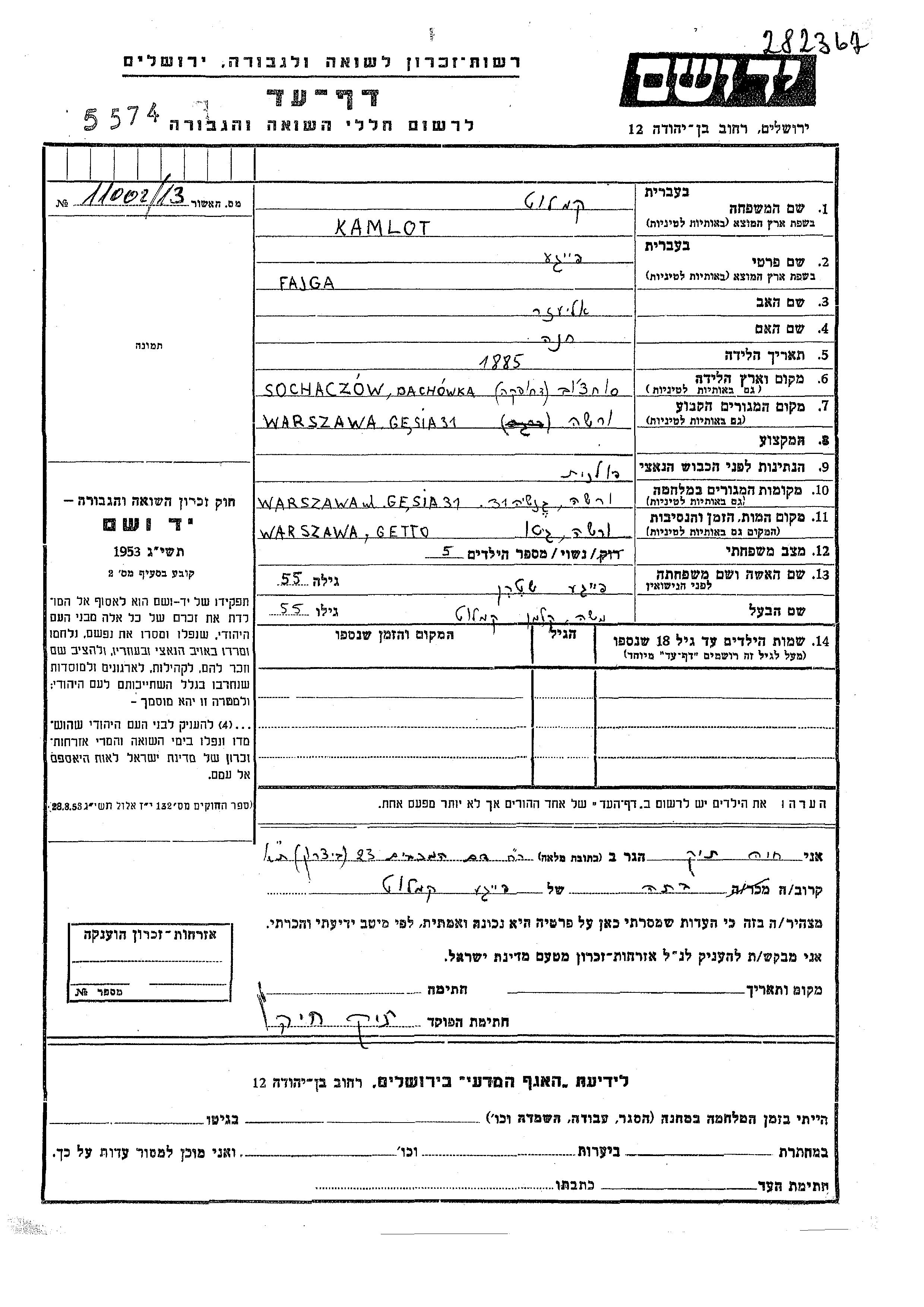 Fajga Kamlot, geb. Shtern wurde im Jahr 1885 in Sochaczew, Polen geboren. Sie war die Tochter von Eliezer und Khana. Sie war mit Moshe Kalman Verheiratet. Vor dem Zweiten Weltkrieg lebte sie in Warsaw, Polen. Während des Krieges war sie in Warsaw, Polen.