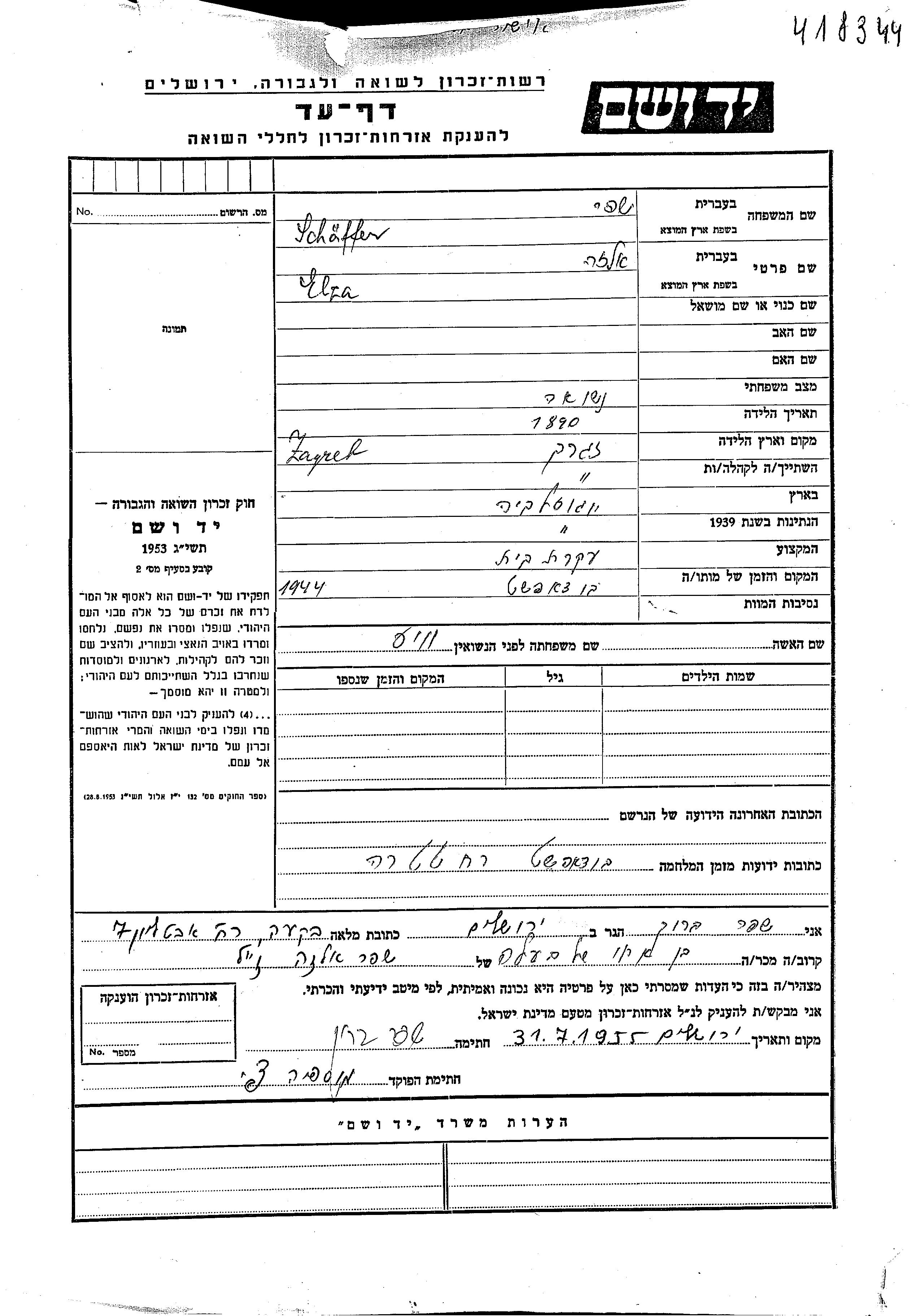 Elza Schaffer, geb. Vais wurde im Jahr 1890 in Zagreb, Jugoslawien geboren. Sie war Hausfrau und Verheiratet. Vor dem Zweiten Weltkrieg lebte sie in Zagreb, Jugoslawien. Während des Krieges war sie in Budapest, Ungarn.