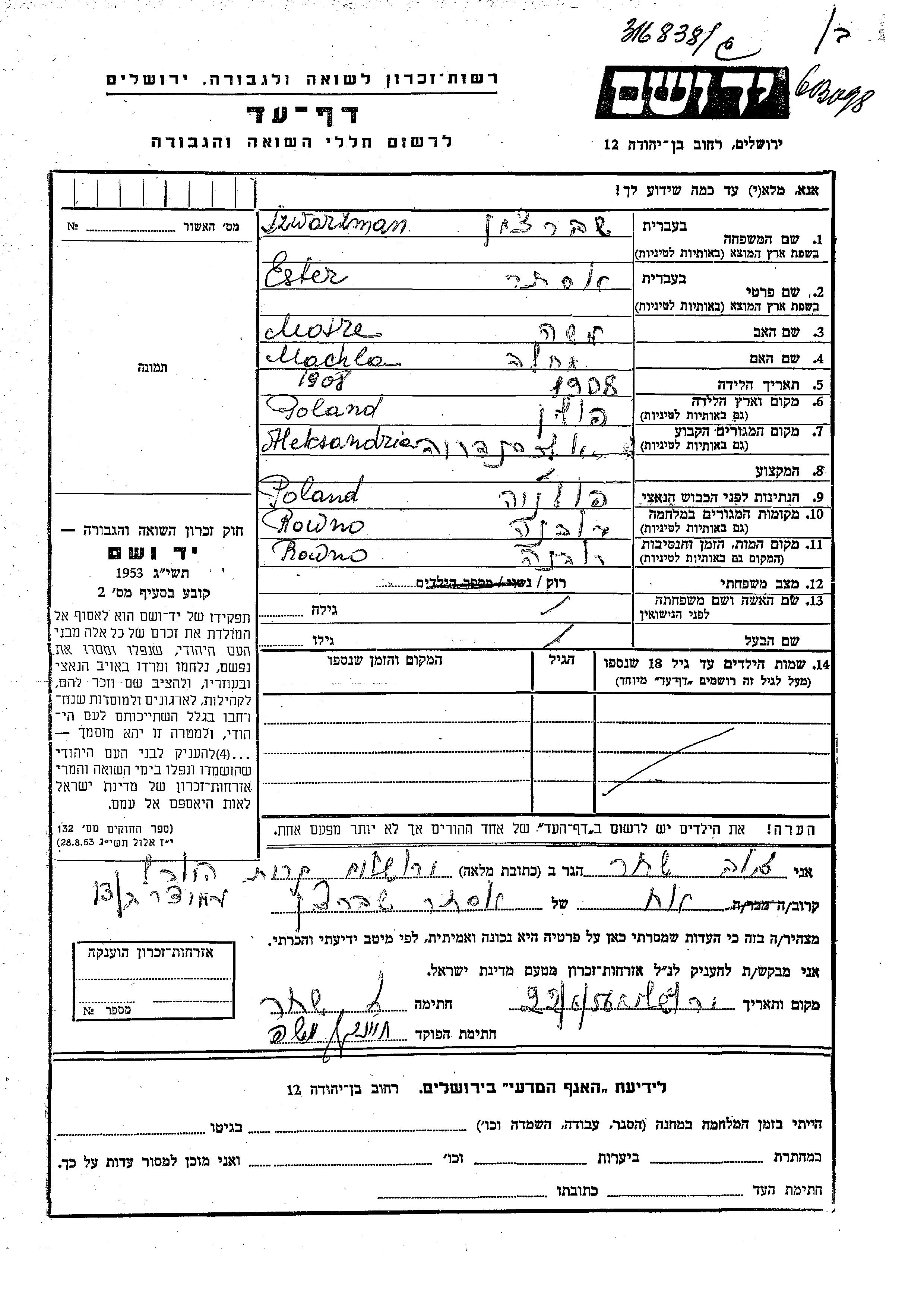 Ester Szwarzman wurde im Jahr 1908 in Polen geboren. Sie war die Tochter von Moshe und Machla. Sie war Ledig. Vor dem Zweiten Weltkrieg lebte sie in Aleksandrja, Polen. Während des Krieges war sie in Rowno, Polen.
