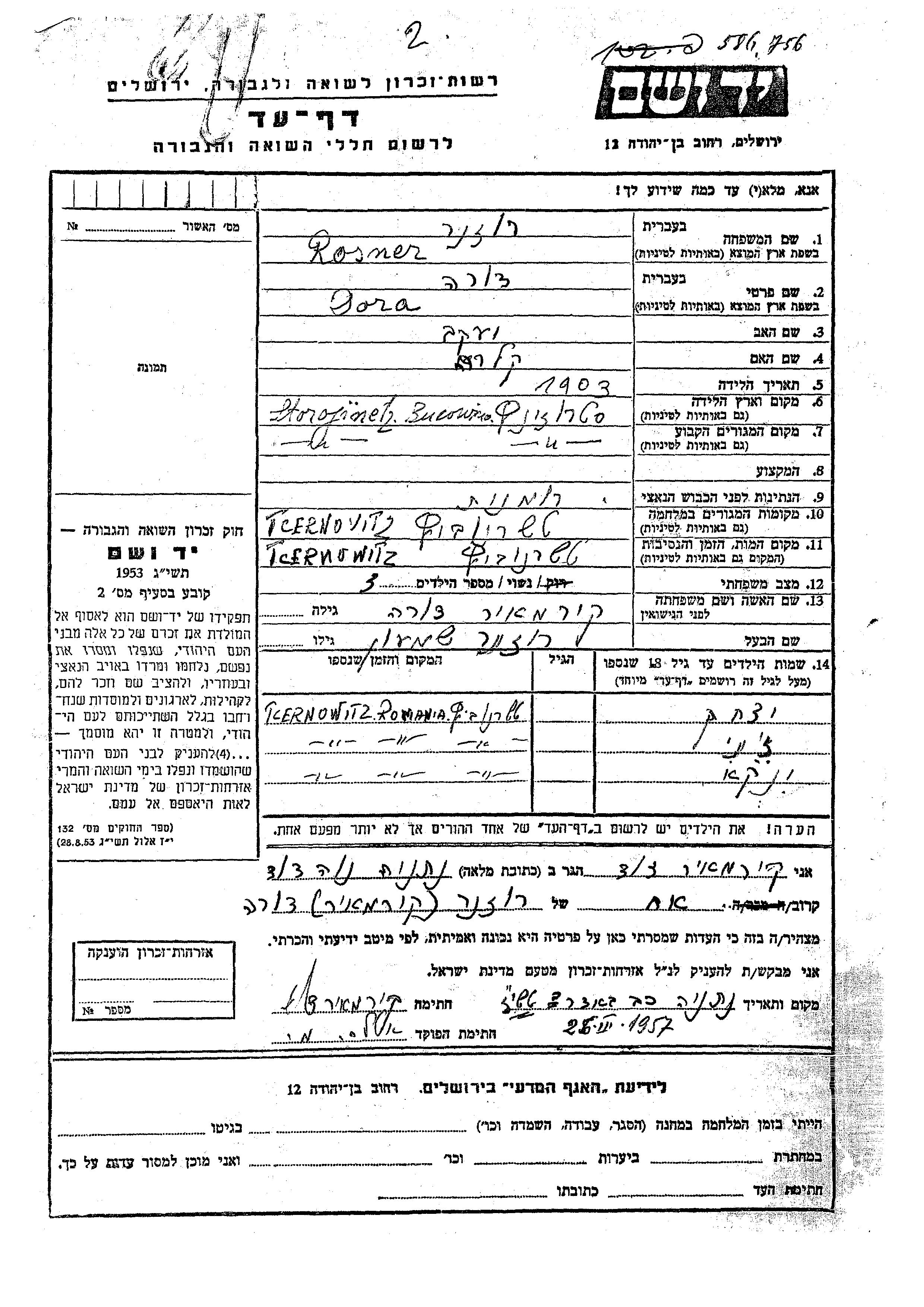 Dora Rosner, geb. Kirmeier wurde im Jahr 1903 in Storozinetz, Rumänien geboren. Sie war die Tochter von Yaakov und Klara. Sie war mit Shimon Verheiratet. Vor dem Zweiten Weltkrieg lebte sie in Storozinetz, Rumänien. Während des Krieges war sie in Cernauti, Rumänien.
