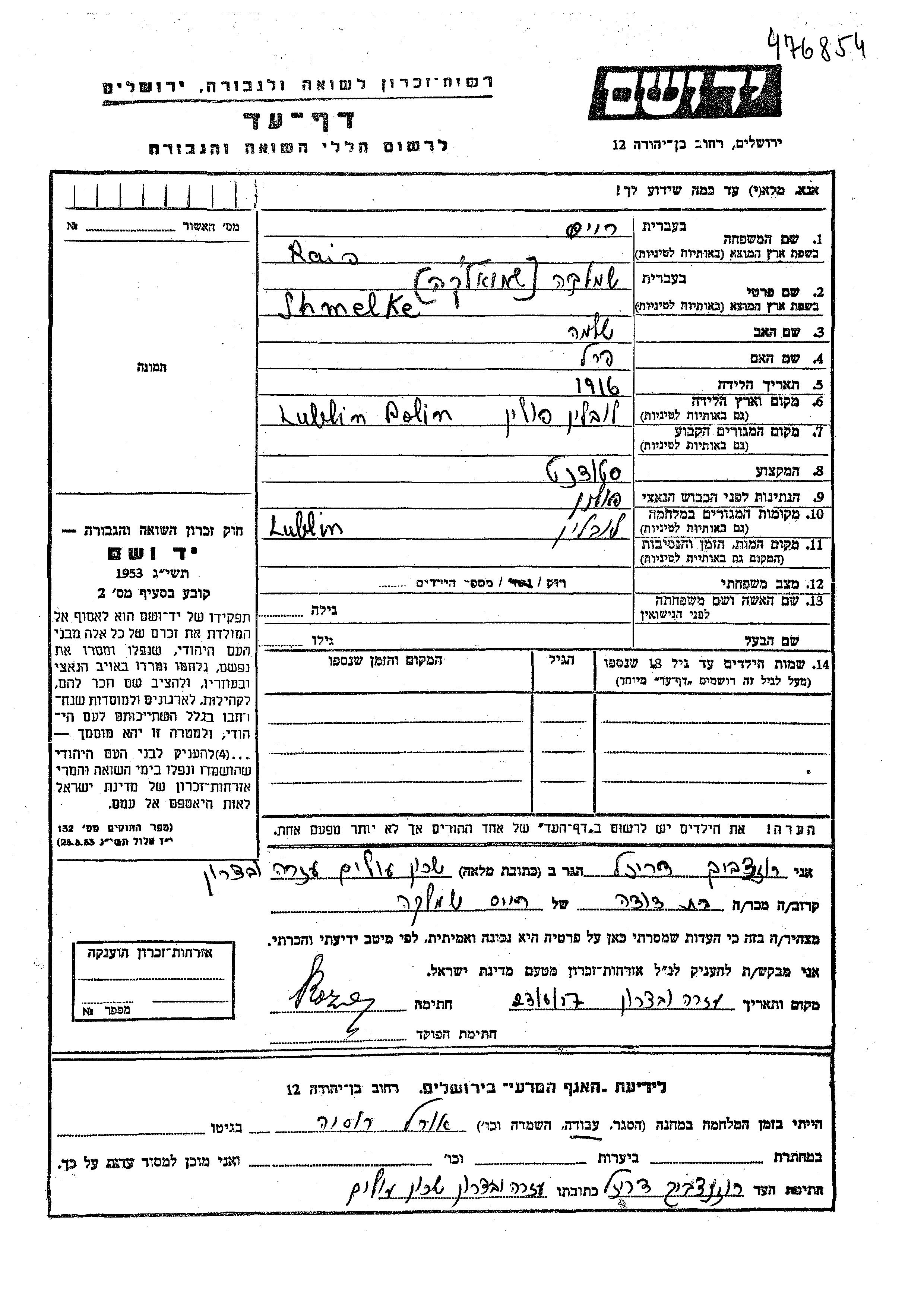 Shmelke wurde in der Schoah ermordet.