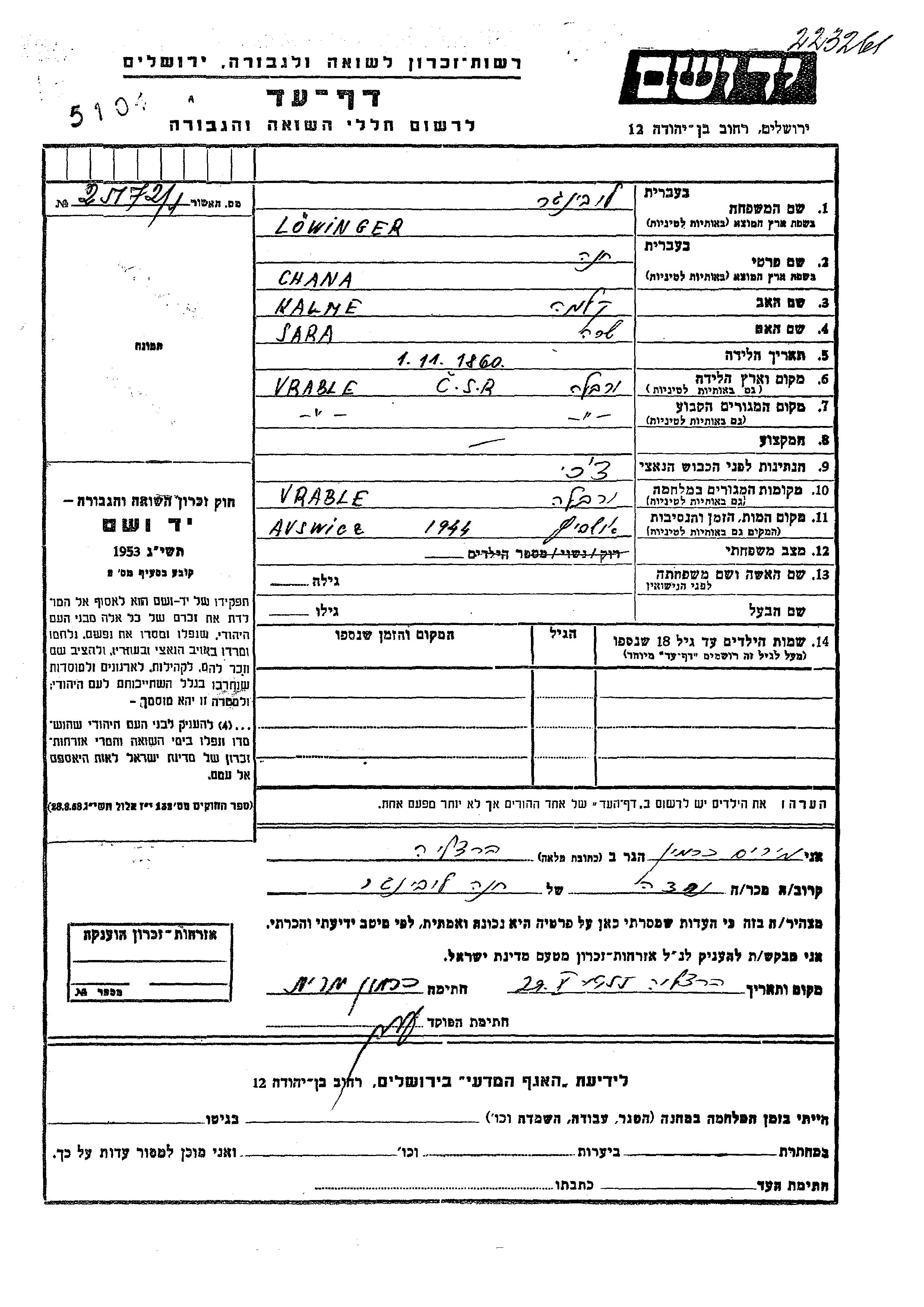 Löwinger Lubinger Chana 1860 Vrable, Tschechoslowakei Gedenkblatt