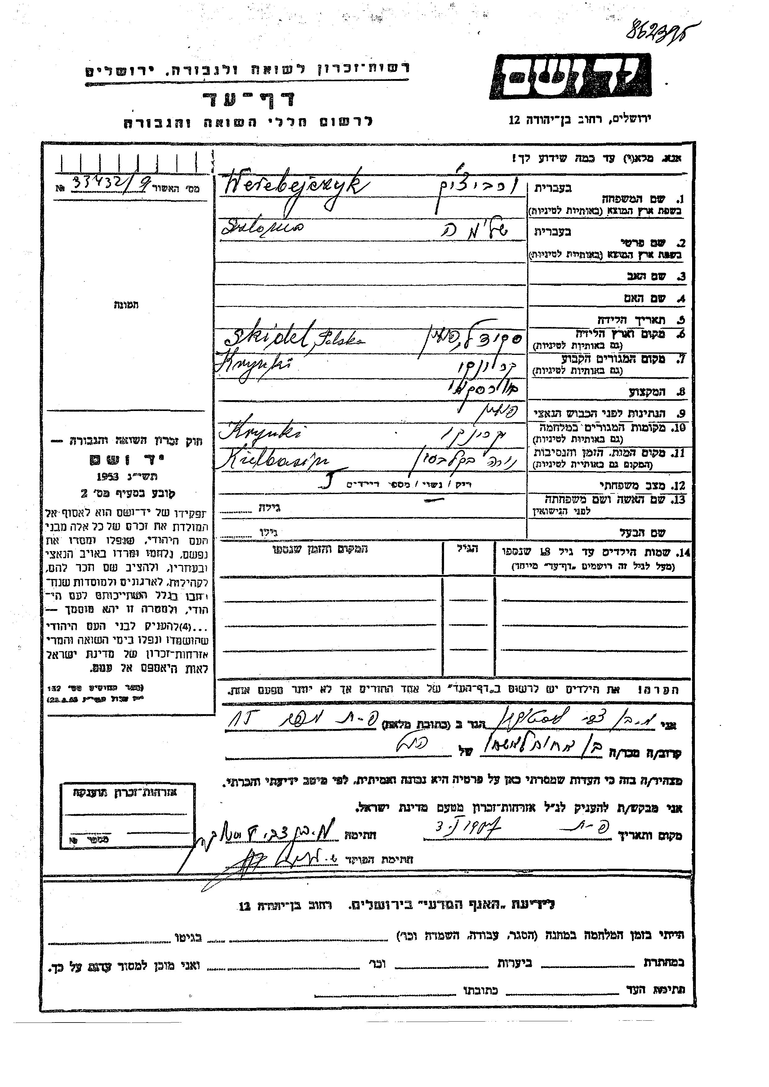 Szlomo Werebejczyk wurde in Skidel, Polen geboren. Er war Gerber und Verheiratet. Vor dem Zweiten Weltkrieg lebte er in Krynki, Polen. Während des Krieges war er in Krynki, Polen.
