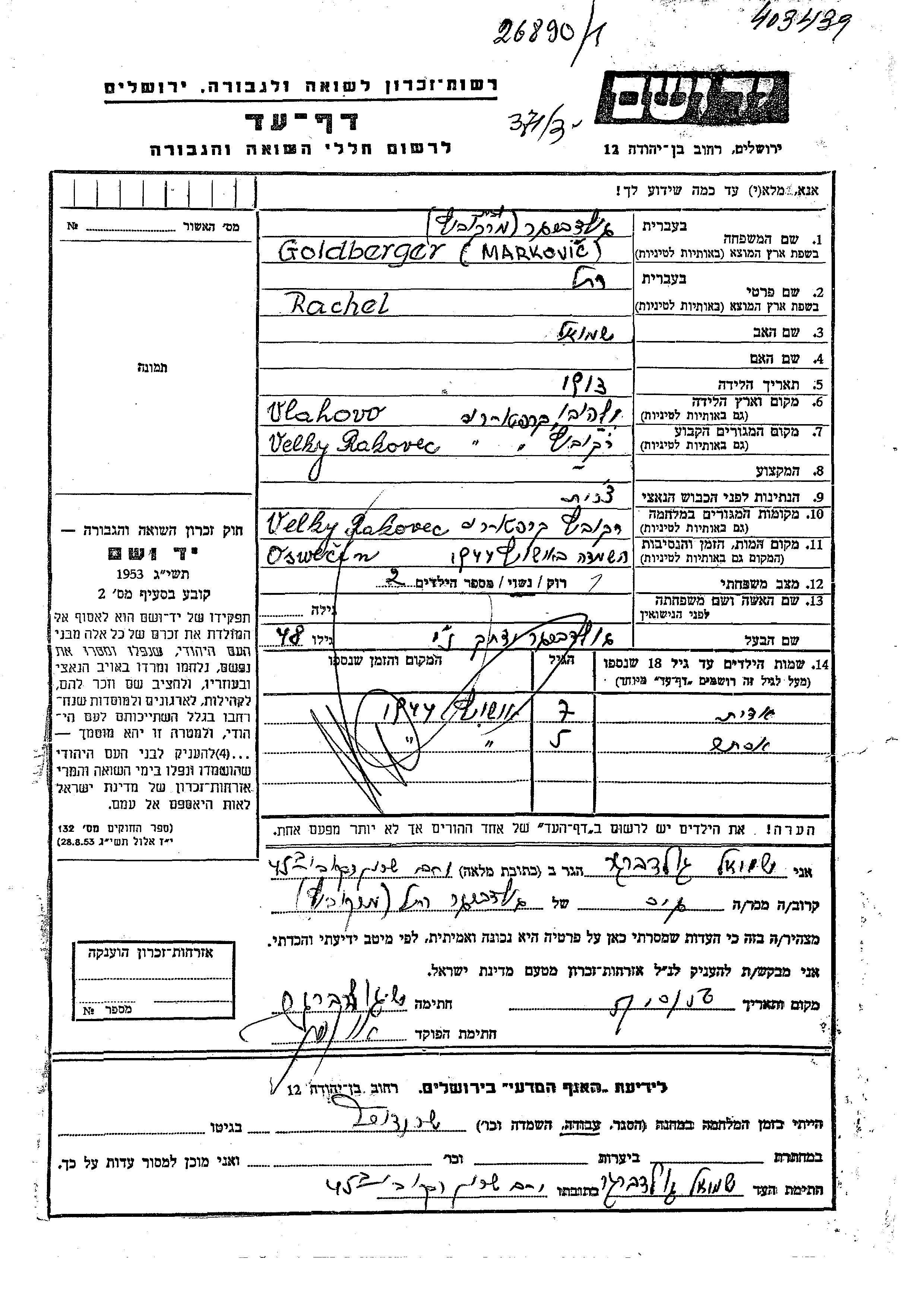Rachel Goldberger, geb. Markovic wurde im Jahr 1913 in Vlahovo, Tschechoslowakei geboren. Sie war die Tochter von Shmuel. Sie war mit Yitzkhak Verheiratet. Vor dem Zweiten Weltkrieg lebte sie in Rakovec Velky, Tschechoslowakei. Während des Krieges war sie in Rakovec Velky, Tschechoslowakei.