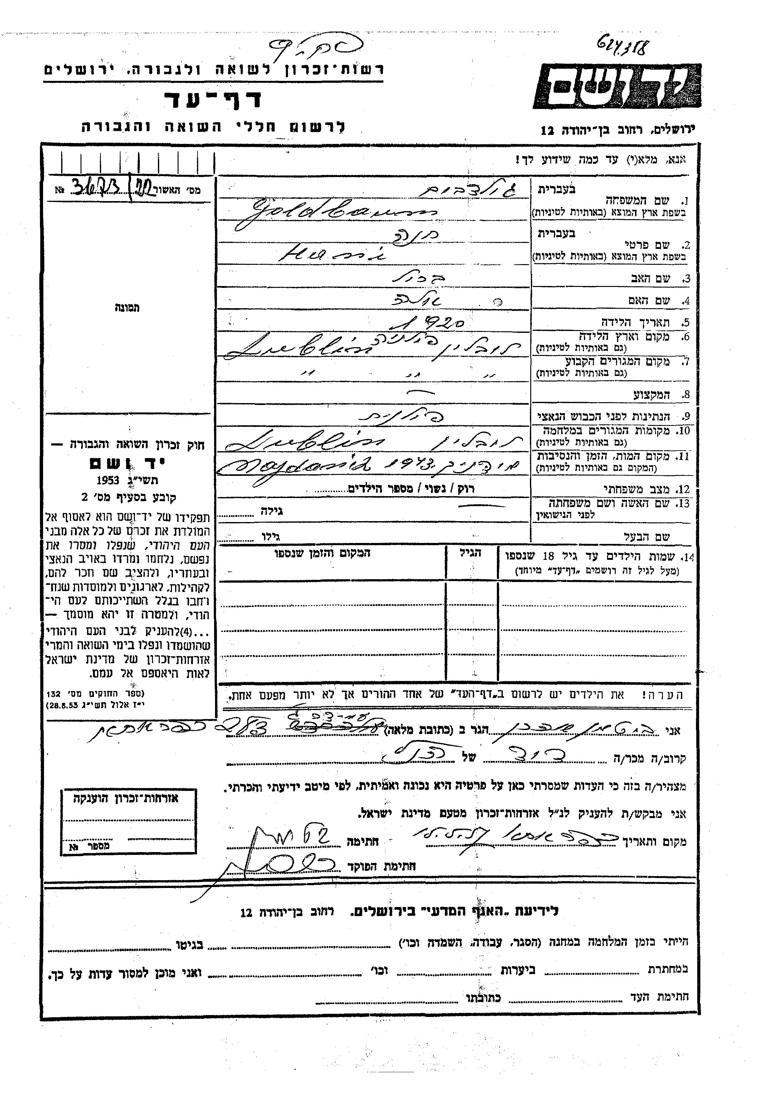 Hani Goldbaum wurde im Jahr 1920 in Lublin, Polen geboren. Sie war die Tochter von Beril und Ela. Sie war Ledig. Vor dem Zweiten Weltkrieg lebte sie in Lublin, Polen. Während des Krieges war sie in Lublin, Polen.