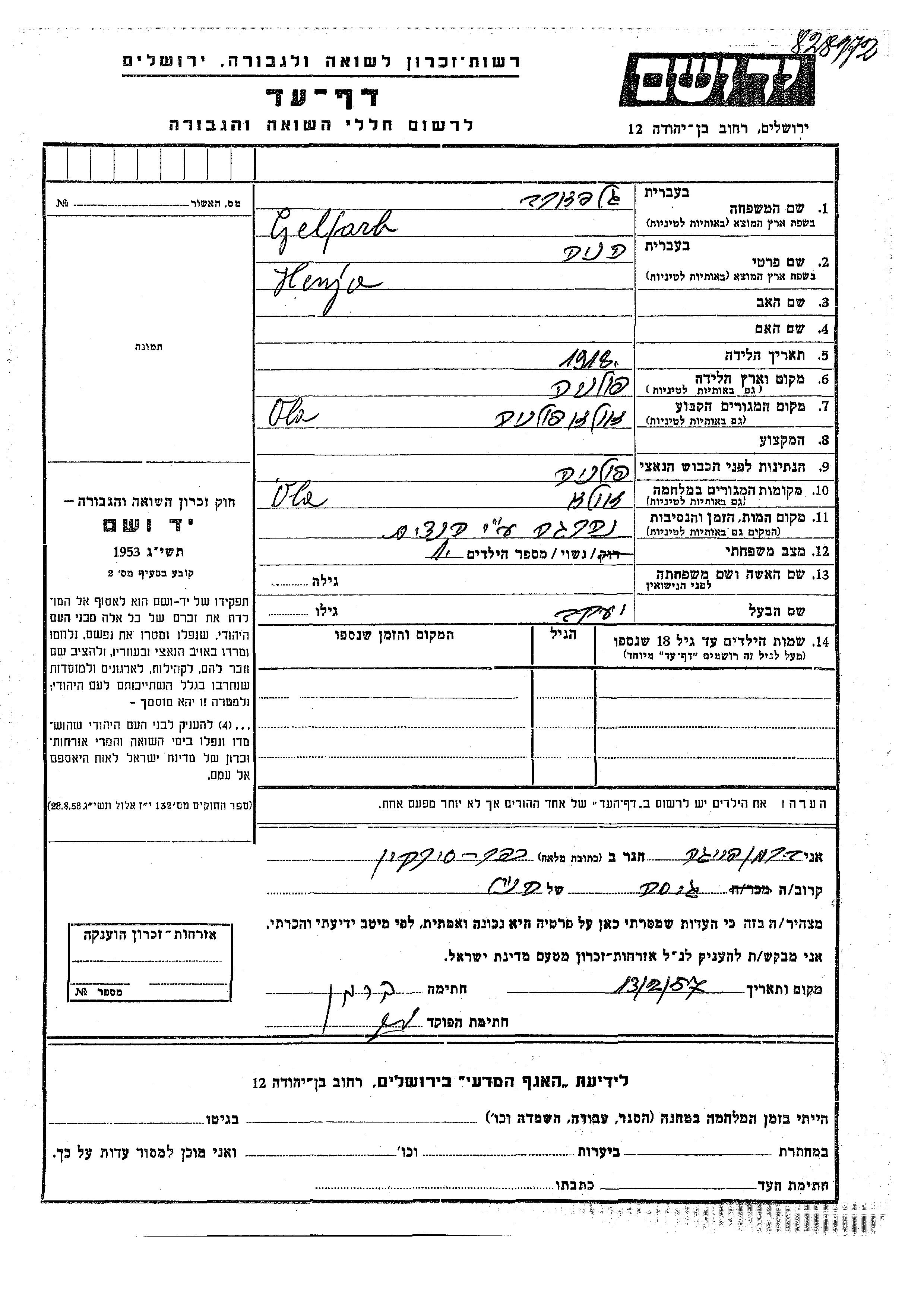 Henya Gelfarb wurde im Jahr 1918 in Polen geboren. Sie war mit Yaakov Verheiratet. Vor dem Zweiten Weltkrieg lebte sie in Ola, Polen. Während des Krieges war sie in Ola, Polen.