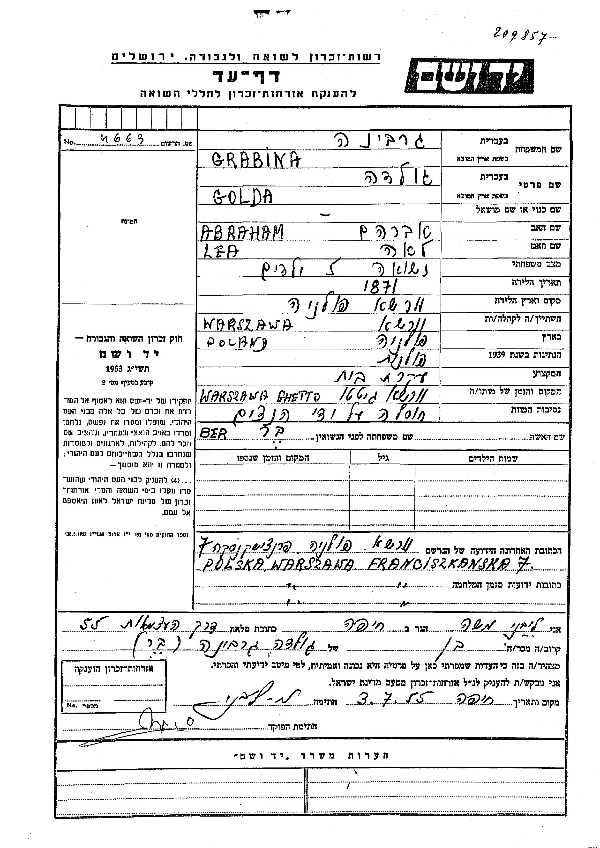 Golda Grabina, geb. Ber wurde im Jahr 1871 in Warsaw, Polen geboren. Sie war die Tochter von Abraham und Lea. Sie war Hausfrau und Verheiratet. Vor dem Zweiten Weltkrieg lebte sie in Warsaw, Polen. Während des Krieges war sie in Warsaw, Polen.