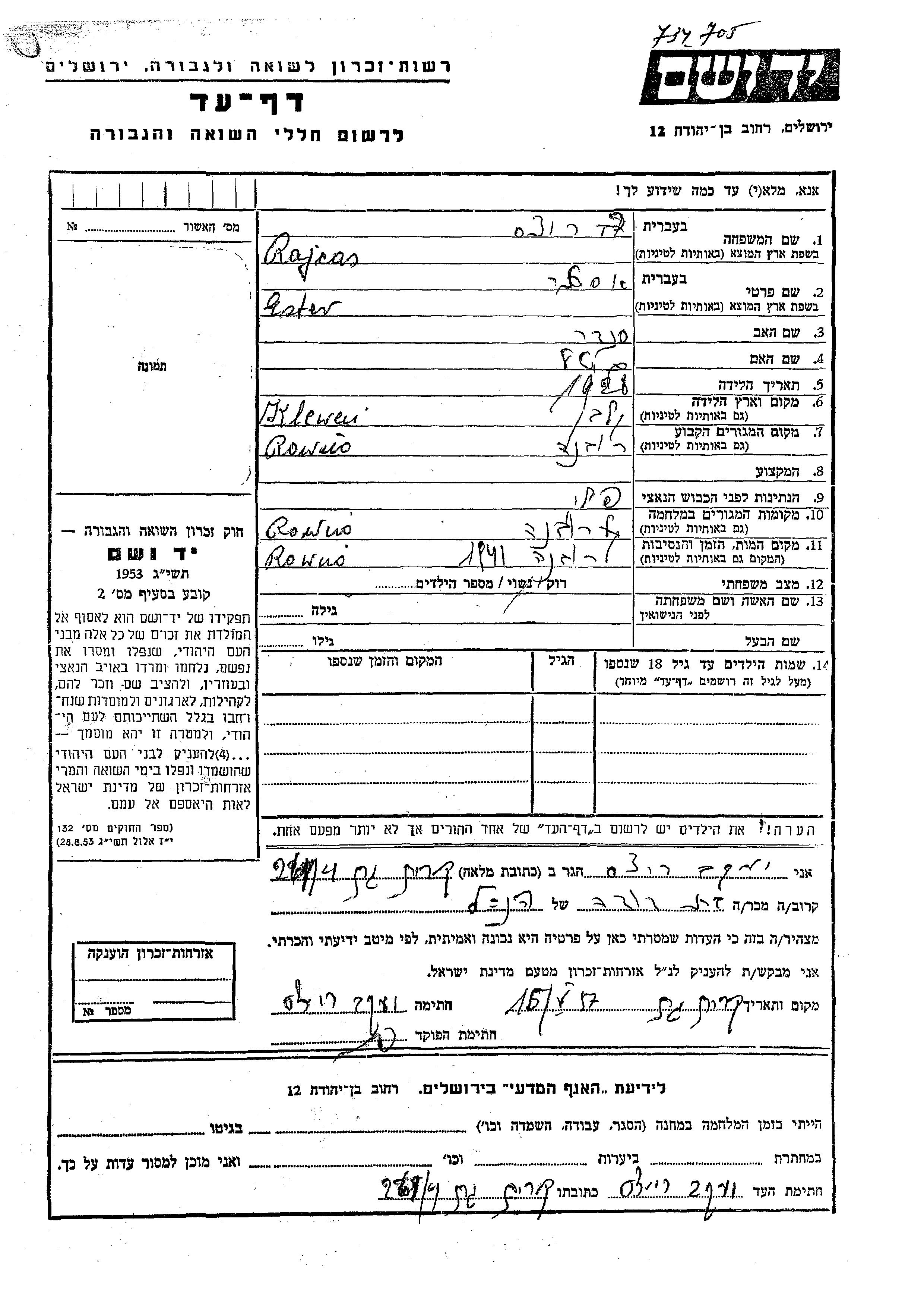Ester Rajcas Riches wurde im Jahr 1928 in Klewań, Polen geboren. Sie war die Tochter von Sender und Gitel. Sie war Ledig. Vor dem Zweiten Weltkrieg lebte sie in Rowno, Polen. Während des Krieges war sie in Rowno, Polen.