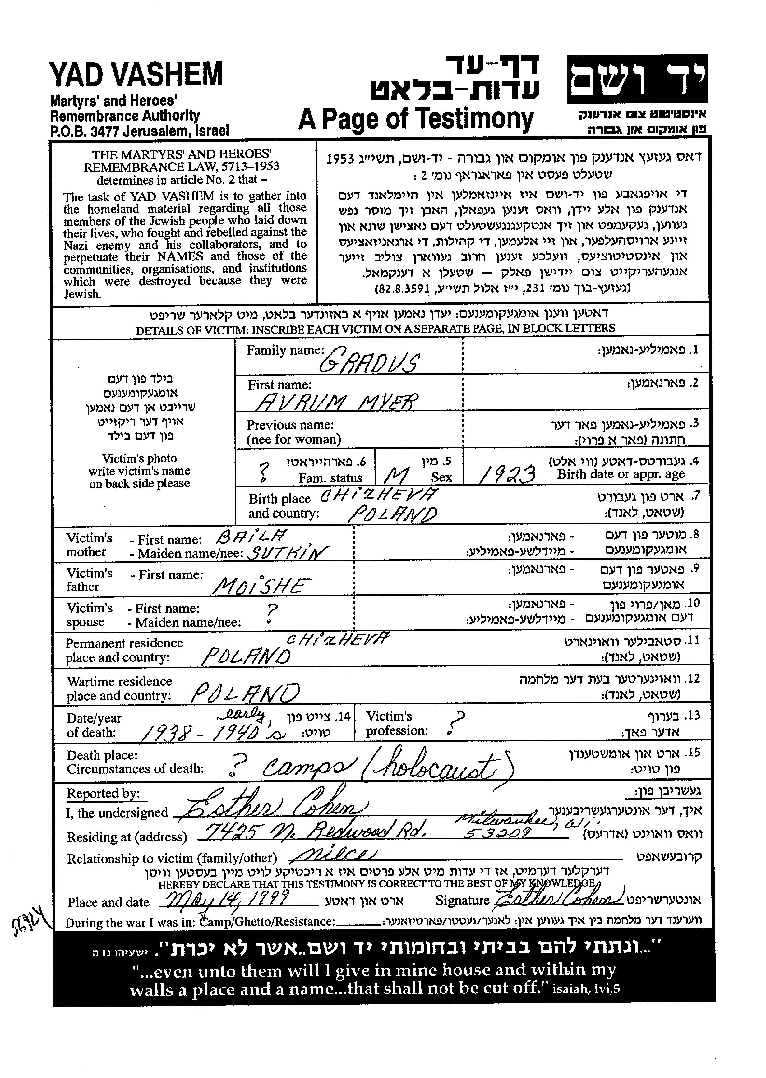 Avrum Myer Gradus wurde im Jahr 1923 in Chizheva, Polen geboren. Er war der Sohn von Moishe und Baila. Vor dem Zweiten Weltkrieg lebte er in Chizheva, Polen. Während des Krieges war er in Polen.