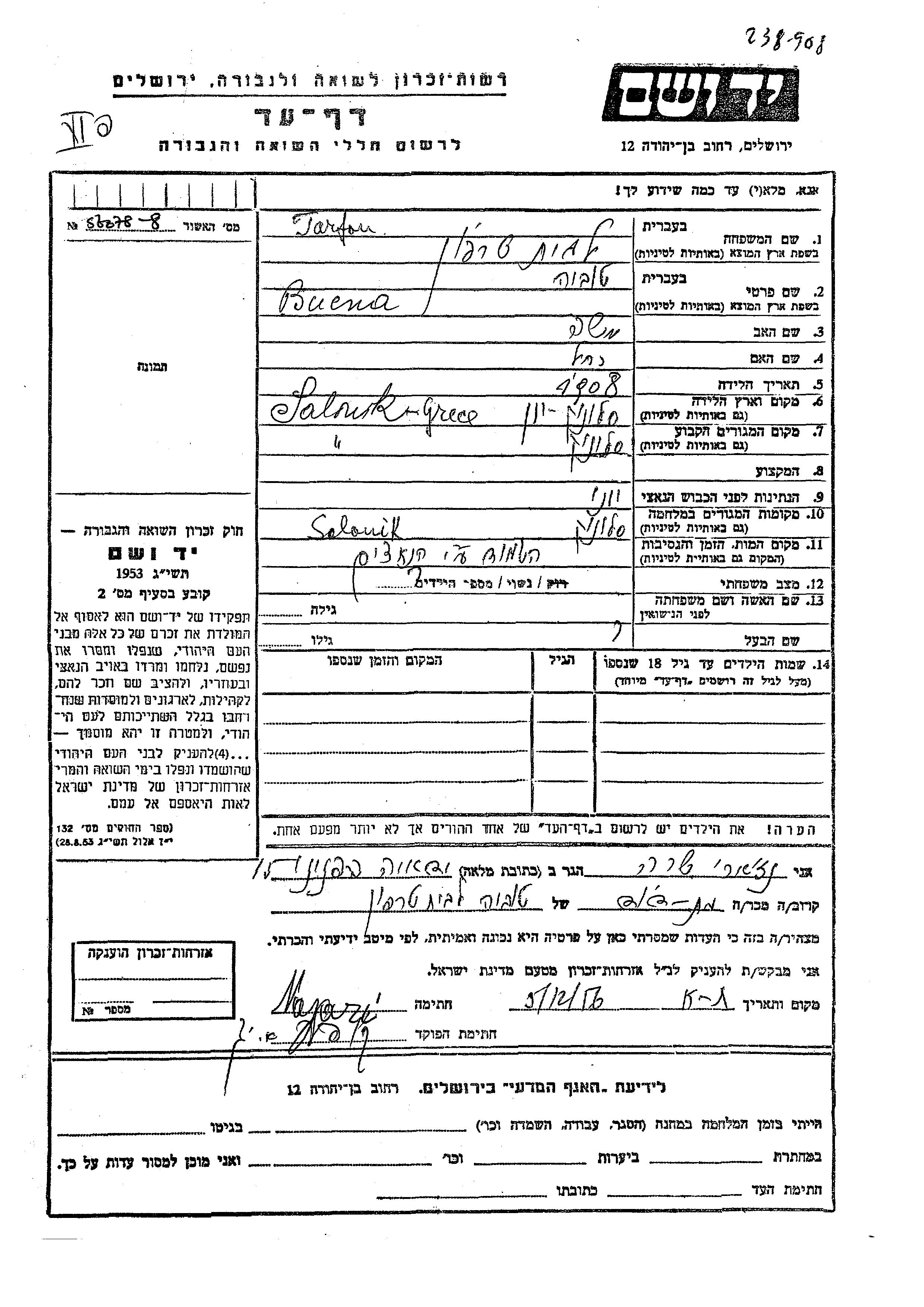 Buena Tuvia Tarfon wurde im Jahr 1908 in Salonika, Griechenland geboren. Sie war die Tochter von Moshe und Rakhel. Sie war Verheiratet. Vor dem Zweiten Weltkrieg lebte sie in Salonika, Griechenland. Während des Krieges war sie in Salonika, Griechenland.