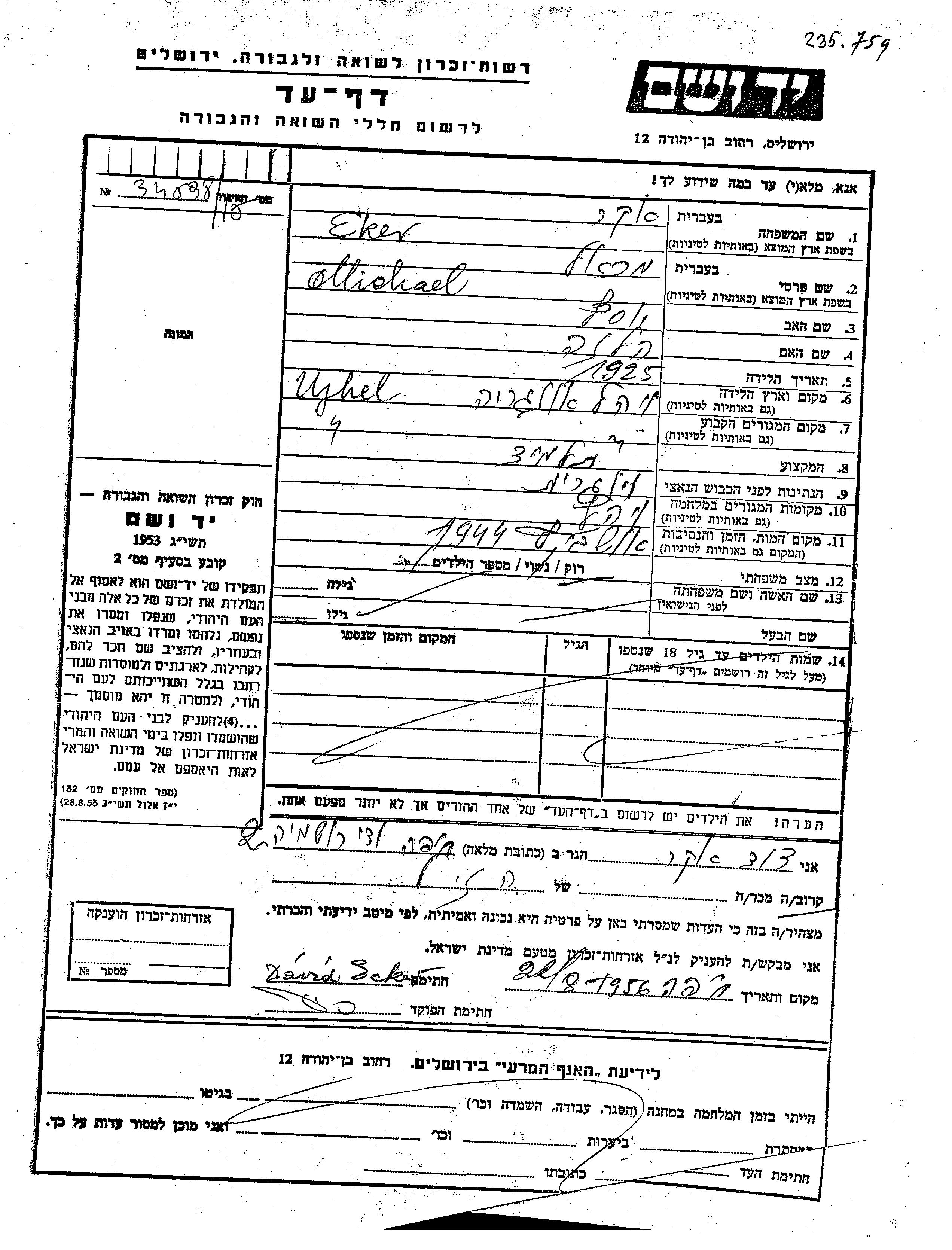 Michael Eker Aker wurde im Jahr 1925 in Ujhely, Tschechoslowakei geboren. Er war der Sohn von Yosef und Helena. Er war Schüler/-in und Ledig. Vor dem Zweiten Weltkrieg lebte er in Ujhely, Tschechoslowakei. Während des Krieges war er in Ujhely, Tschechoslowakei.