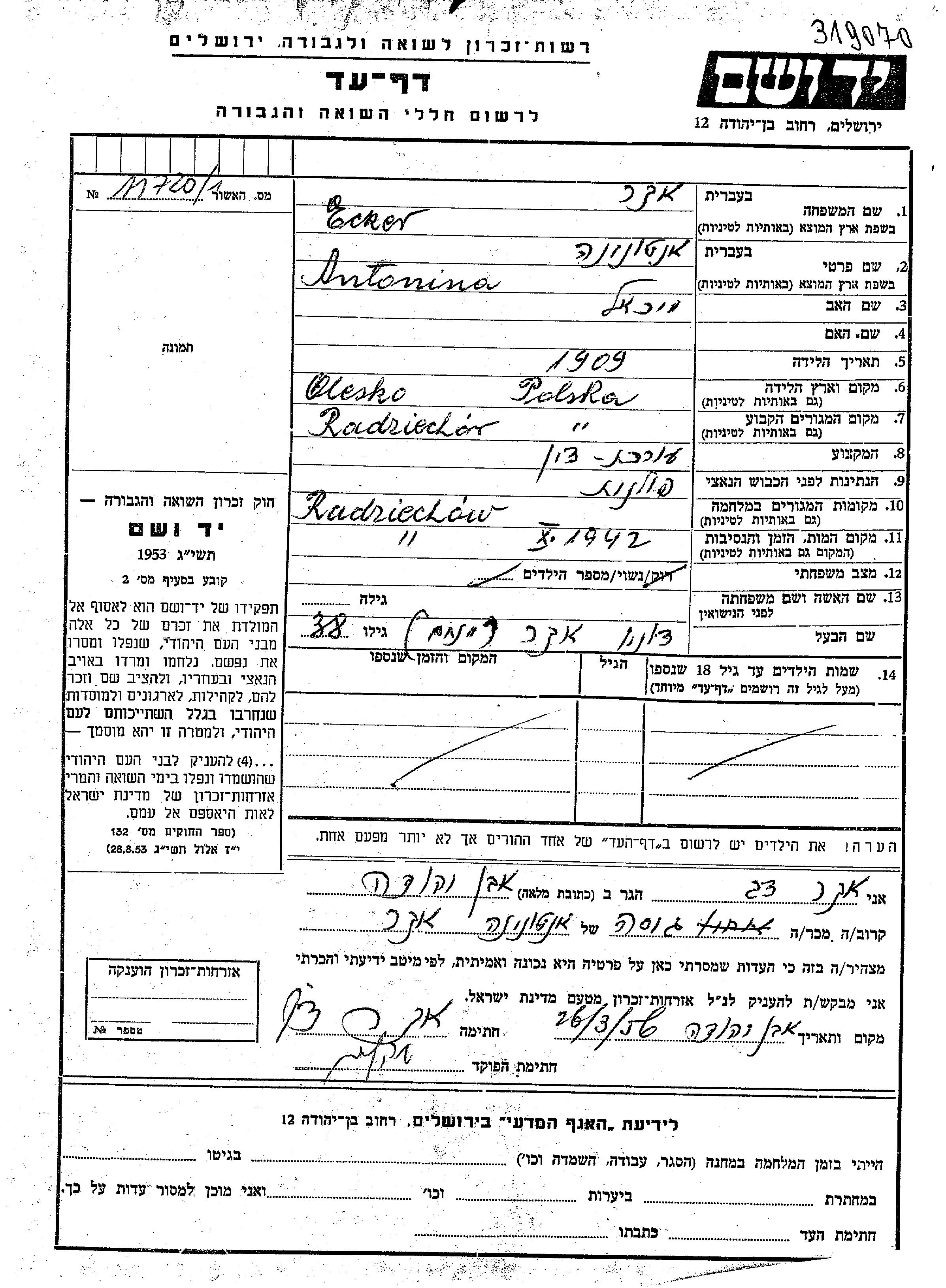 Antonina Ecker Aker wurde im Jahr 1909 in Olesko, Polen geboren. Sie war die Tochter von Mikhael. Sie war Rechtsanwalt/rechtsanwältin und mit Dunio Menakhem Verheiratet. Vor dem Zweiten Weltkrieg lebte sie in Radziechow, Polen. Während des Krieges war sie in Radziechow, Polen.