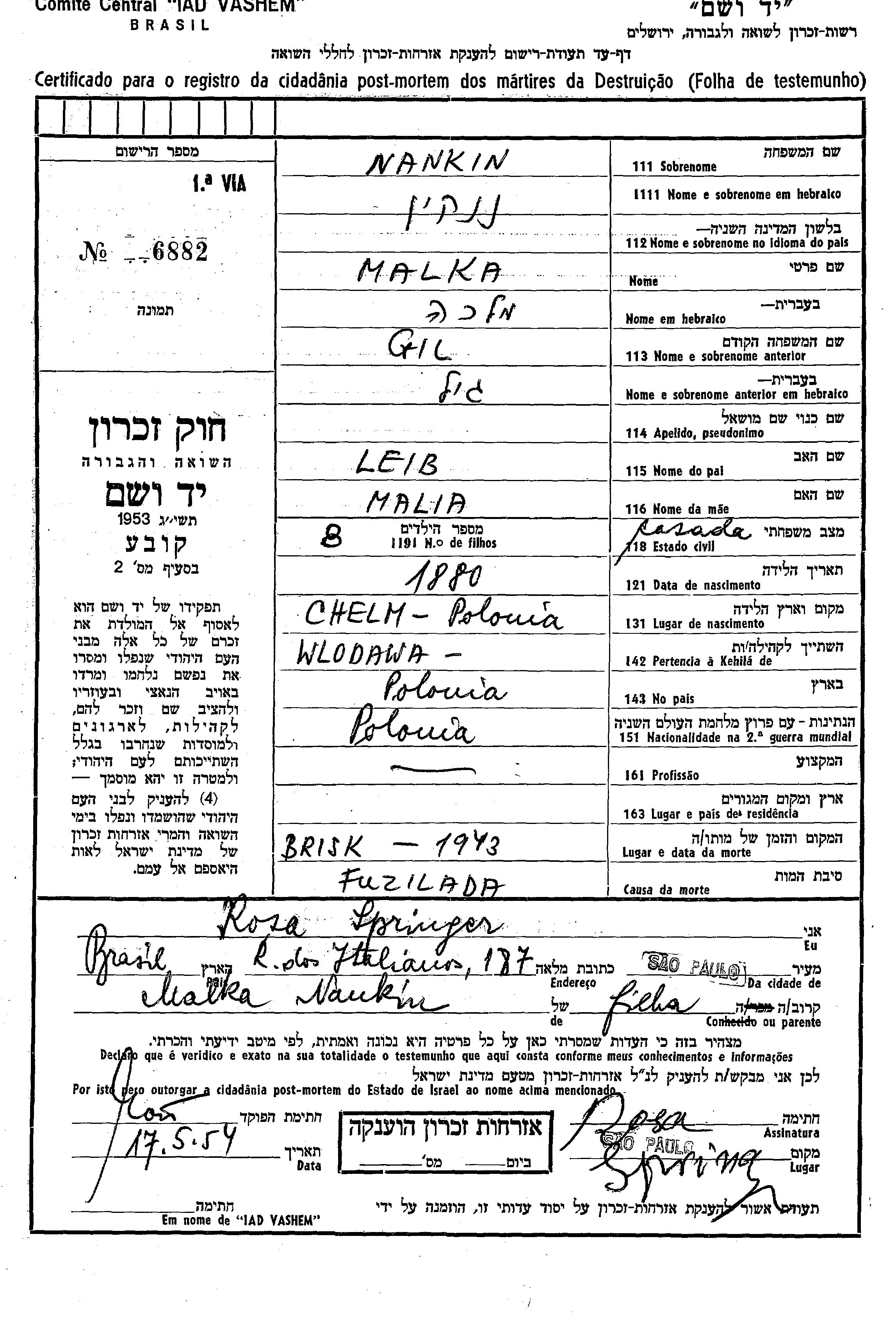 Malka Nankin, geb. Gil wurde im Jahr 1880 in Chelm, Polen geboren. Sie war die Tochter von Leib und Malia. Sie war Verheiratet. Vor dem Zweiten Weltkrieg lebte sie in Wlodawa, Polen. Während des Krieges war sie in Polen.